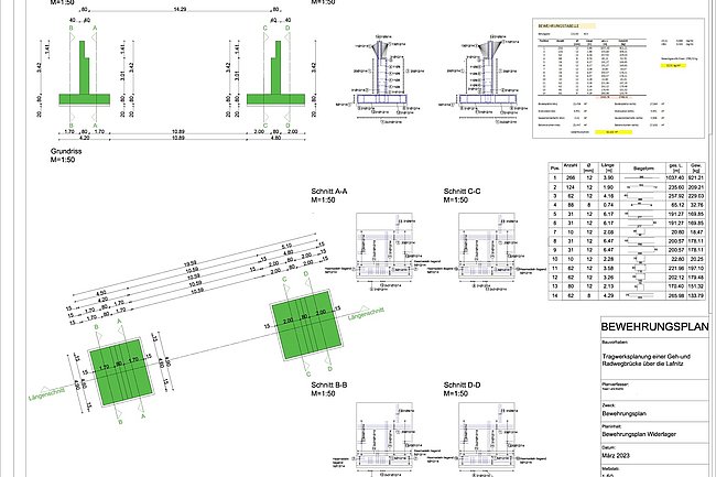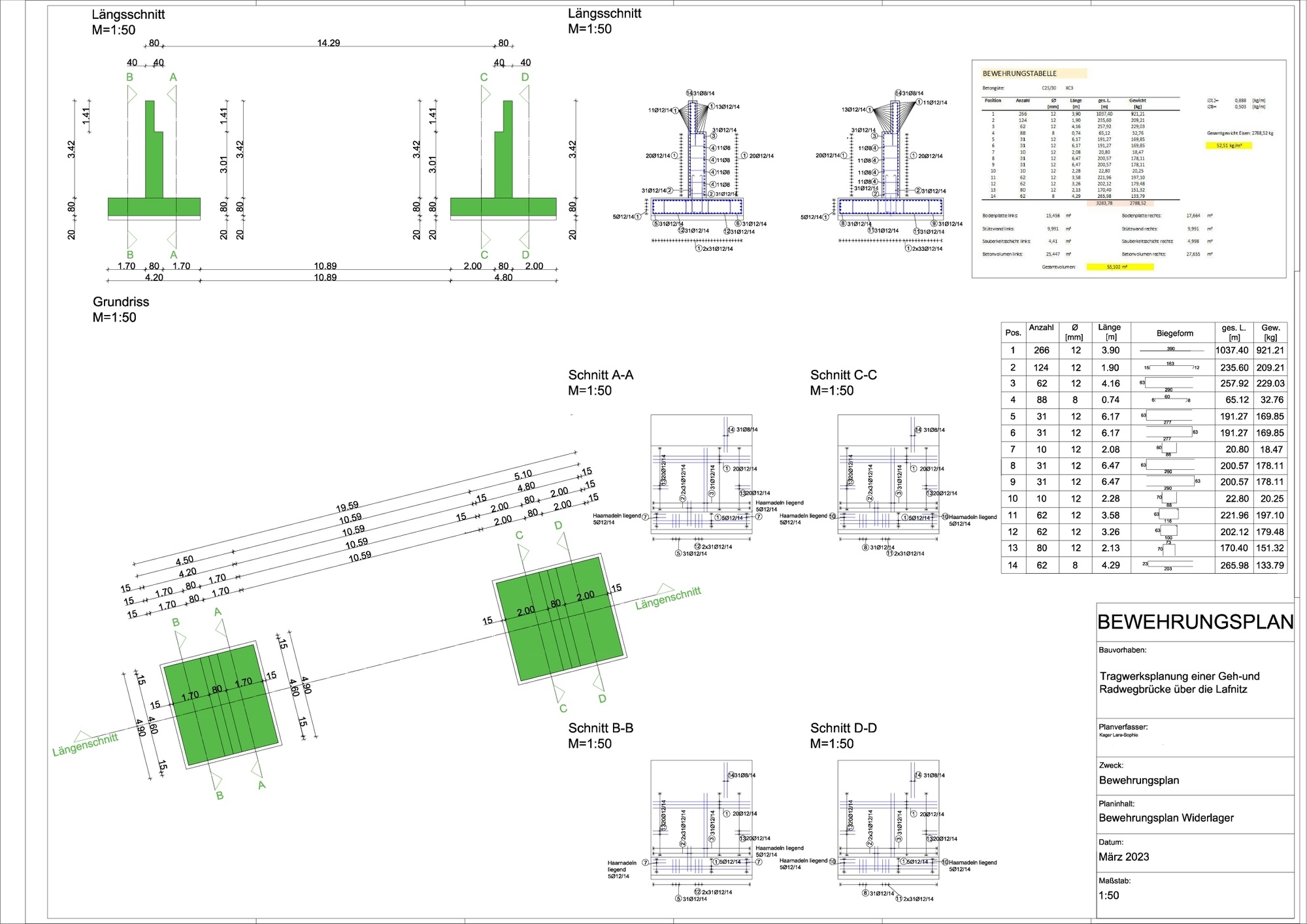 Ziele der Arbeit umfassten die Ausarbeitung eines gemeinsamen Entwurfskonzepts, als auch die statische Berechnung von einem Brückentragwerk und dessen Stahlbetonwiderlager.