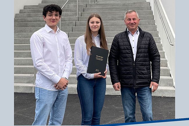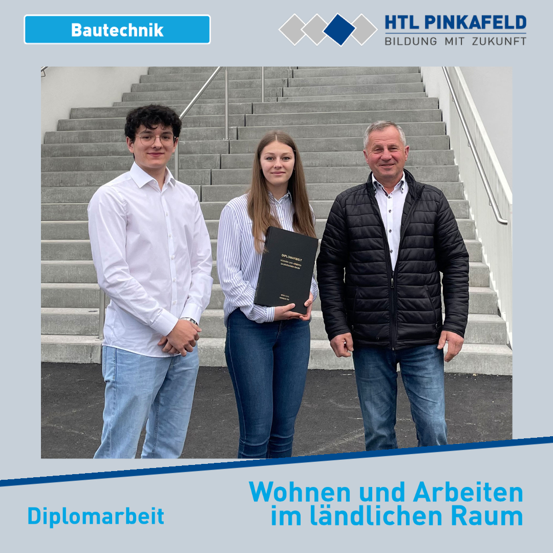 Ende März wurde die Diplomarbeit „Wohnen und Arbeiten im ländlichen Raum“ von Bautechnik-Maturantin Sophie Glatzl und -Maturant Maximilian Zink an den Bürgermeister der Marktgemeinde Draßmarkt Anton Wiedenhofer übergeben. Betreut wurde die Arbeit von Prof. Thomas Wagner.