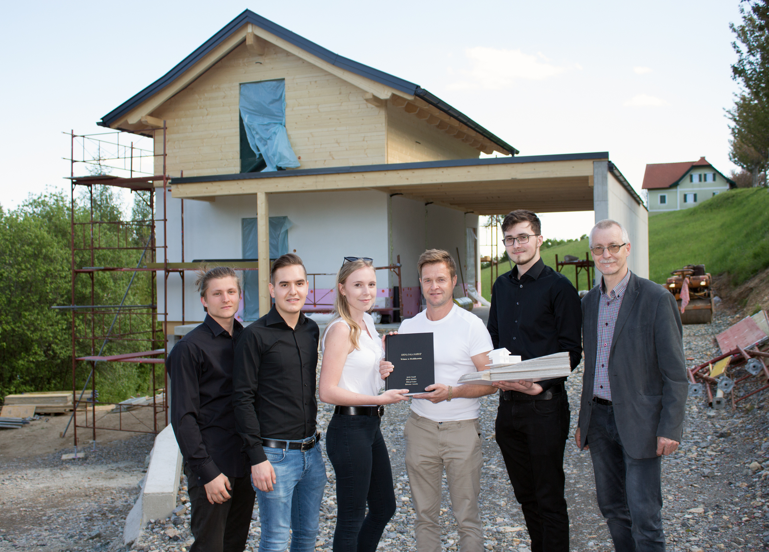 „Gutes Timing“ hieß es am Pöllauberg bei der Diplomarbeit „Wohnen in Modulbauweise“ von den Bautechnik-Maturanten Dániel Jakab, Matthias Mock, Lukas Pirkopf und Antonia Schreiner, die passend zur Fertigstellung des Rohbaus an den Auftraggeber Gerald Klein übergeben wurde.
