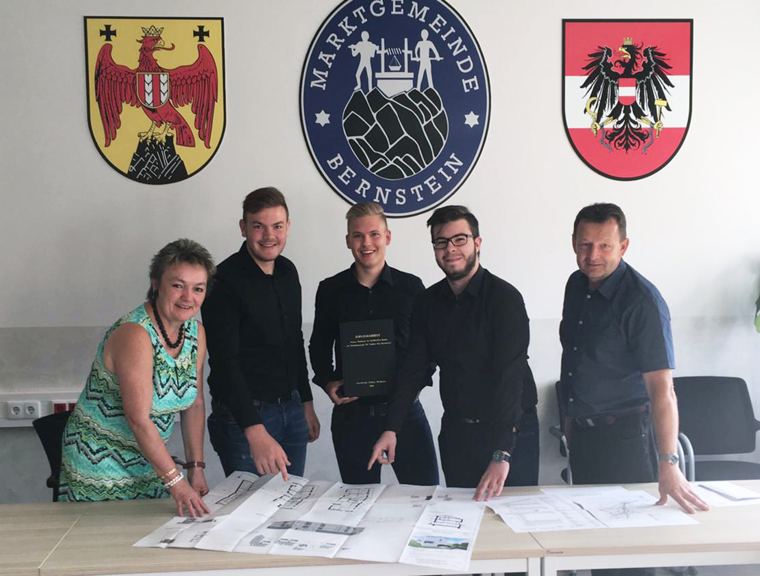 Kürzlich wurde die Bautechnik-Diplomarbeit „Neues Wohnen im ländlichen Raum - ein Wohnkonzept für Stuben bei Bernstein“ von den HTL Pinkafeld-Maturanten Robert Schütz, Stefan Winhofer und Matthias Kornfeind an Bürgermeisterin Renate Habetler übergeben.