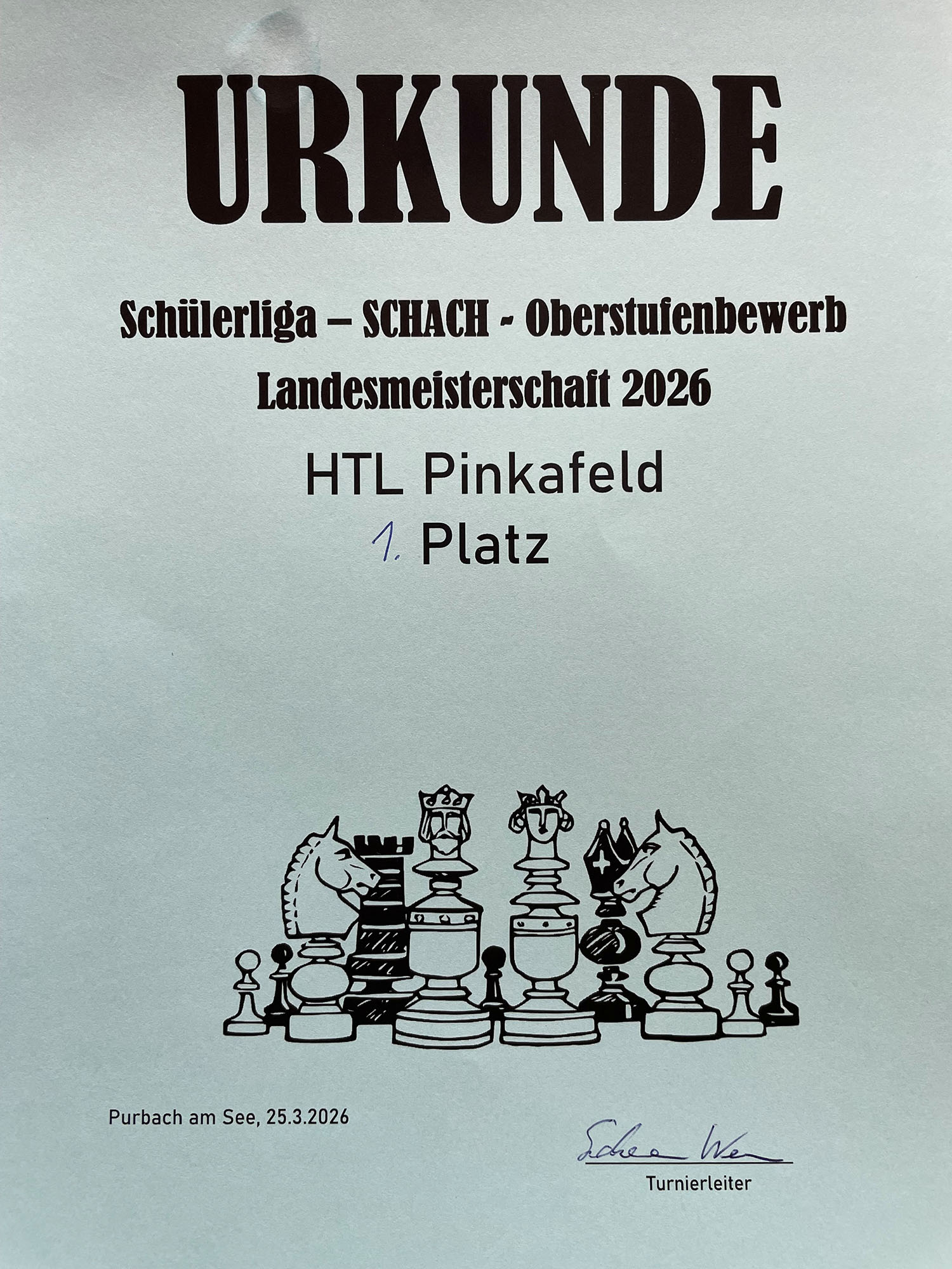 Diesmal haben sieben Schüler und eine Schülerin die HTL Pinkafeld beim Finale vertreten. Nico Marakovits, Felix Stögerer, Bence Jokai, Matthias Stöberl, Hannes Vögl, Nick Höller, Adrian Skach und Emily Wurm setzten sich souverän gegen die HTL Eisenstadt, HAK Eisenstadt, das BG Mattersburg und das BG Neusiedl durch. Somit dürfen die von Prof. Thomas Tiefengraber betreuten Schachspielerinnen – und -spieler der HTL Pinkafeld wieder das Burgenland beim der Bundesfinale in Linz vertreten.