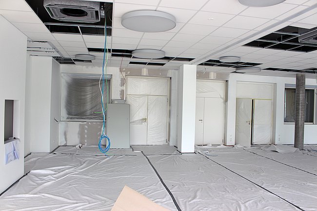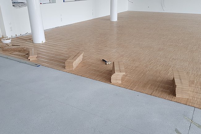 Die Fertigstellungsarbeiten am neuen Fest- und Mehrzwecksaal konnten im Innenbereich kurz vor Ostern weitestgehend abgeschlossen werden. Der nun bereits der HTL zur Verfügung stehende Saal wird allerdings in den nächsten Monaten noch als Ausweichquartier für Lehrer*innen während der Sanierungsarbeiten am Verwaltungstrakt benötigt, erst im Herbst werden auch Veranstaltungen möglich sein.