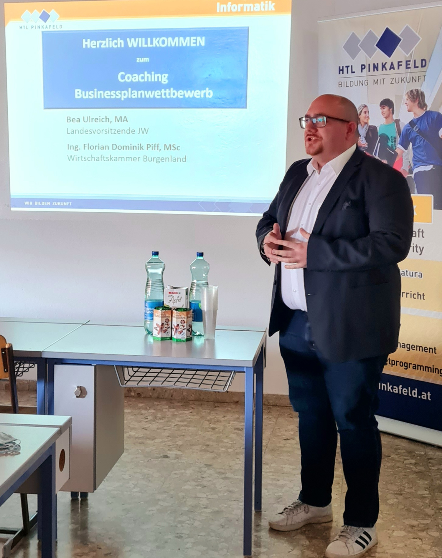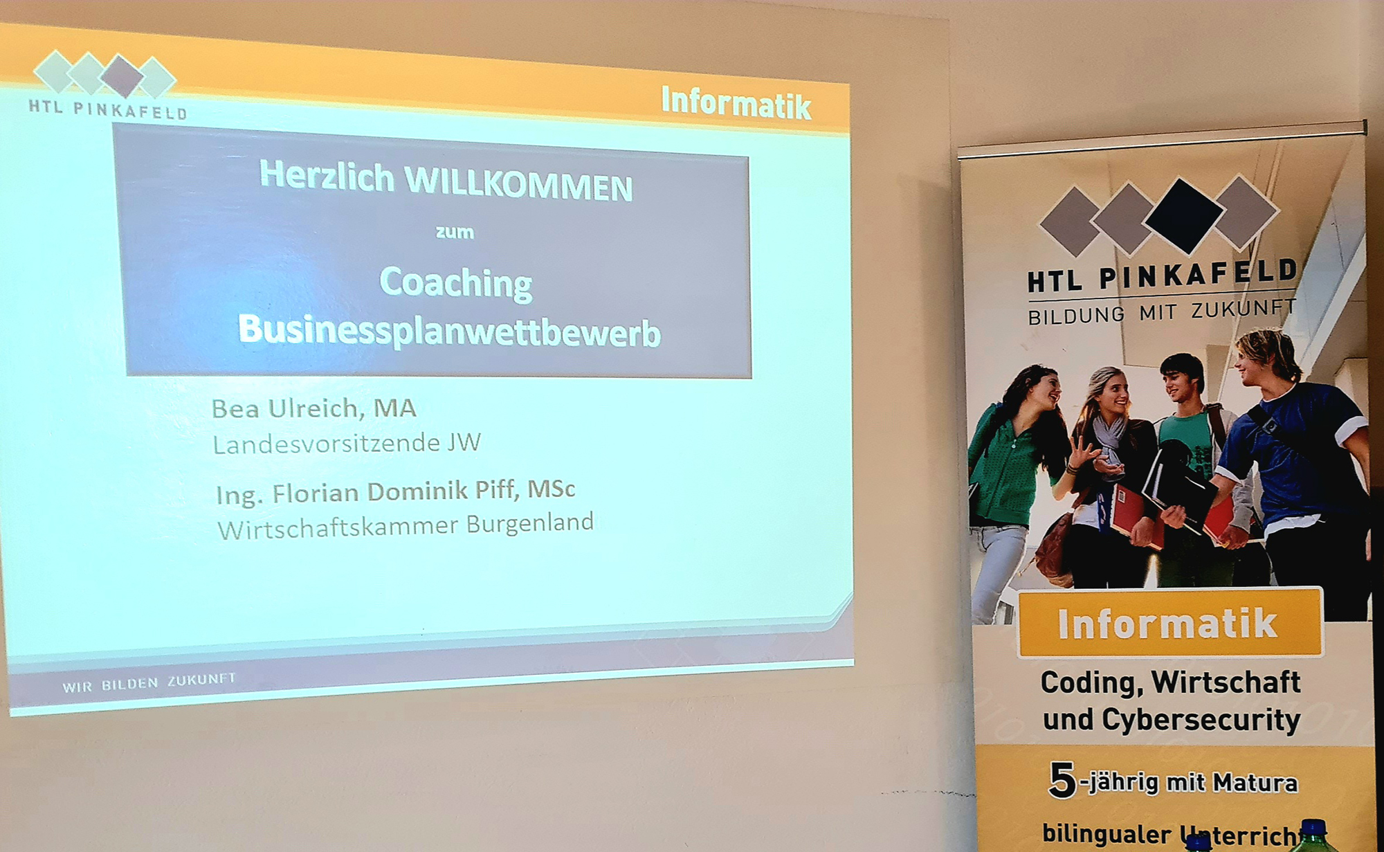 Ende März fand ein externes Coaching der Teams durch die zwei Vertreter der Wirtschaftskammer Burgenland Bea Ulreich MA und Ing. Florian Piff MSc statt. Die Teams starteten mit einem dreiminütigen Pitch, in dem sie ihre Geschäftsidee eindrucksvoll vorstellten, und erhielten danach individuelles Feedback zu ihren Vorhaben. Danach gaben die beiden externen Coaches mit ihrer mehrjährigen Erfahrung in der Gründungsszene wertvolle Tipps zum Gestalten von Businessplänen. In dieser lockeren Diskussionsrunde erfuhren die Schülerinnen und Schüler auch, dass Kundenorientierung an oberster Stelle stehen müsse und das Austesten der Geschäftsidee an möglichen Kunden immens wichtig sein, um herauszufinden, ob die Idee überhaupt realisierbar sei.