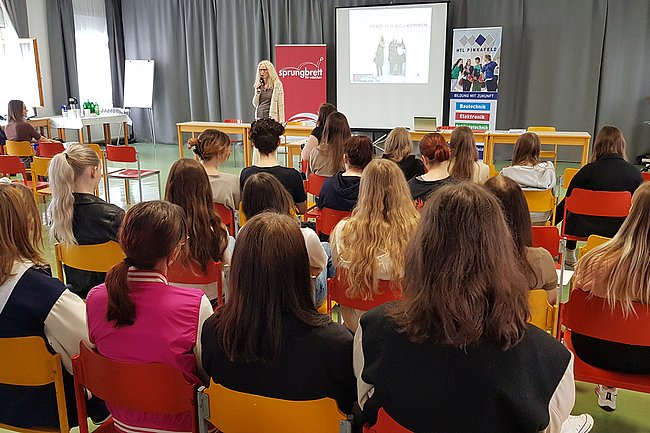 Ingrid Puschautz-Meidl von der Industriellenvereinigung Burgenland und BSc Antonia Schmid von FIT Sprungbrett hielt FIT-Botschafterin Kathrin Neuherz, selbst Absolventin der HTL Pinkafeld, die Eröffnungsrede und informierte über die Informationsmöglichkeiten durch FIT Sprungbrett. Weiters fand sie ermutigende Worte an die anwesenden HTL-Schülerinnen der 3. und 4. Jahrgänge aller vier Abteilungen, auch nach Abschluss der HTL Weiterbildungsmöglichkeiten im MINT Bereich in Angriff zu nehmen und in der Technik zu bleiben.