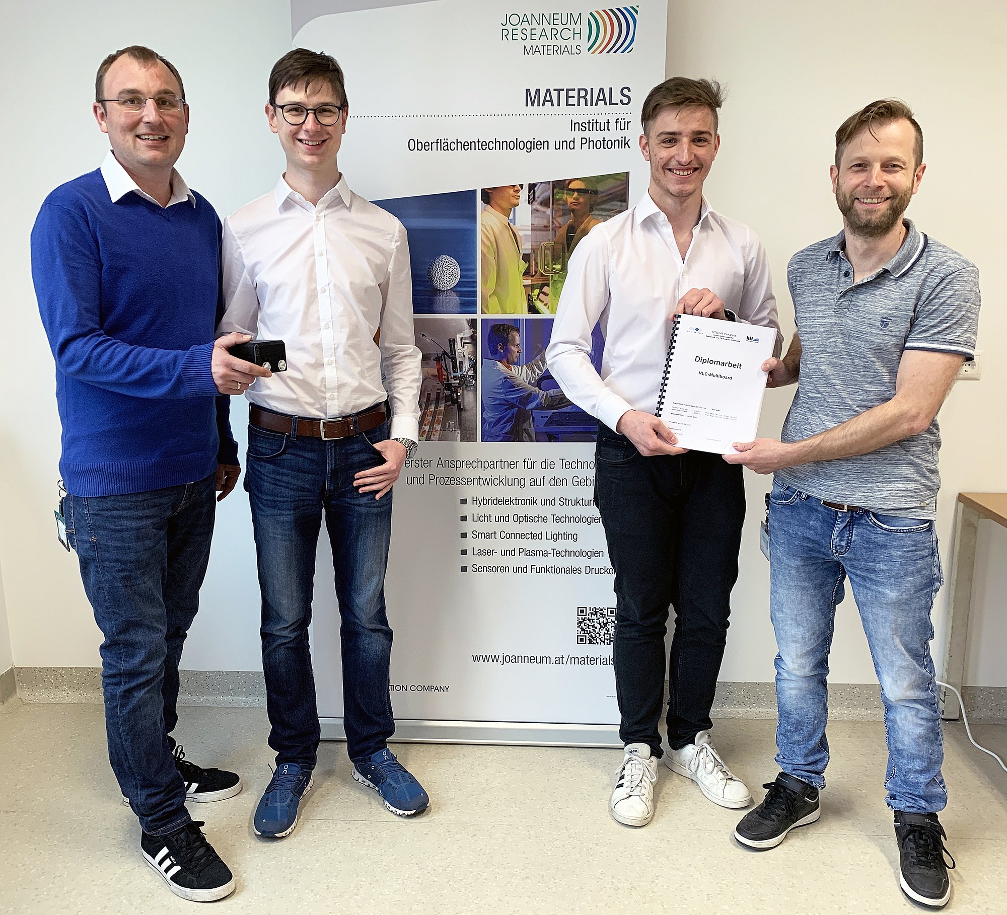 Die Elektronik-Maturanten Maximilian Winkler und Florian Traussnigg haben ihre Diplomarbeit „VLC-Multiboard“ erfolgreich abgeschlossen und kürzlich an den Auftraggeber Dr. Andreas Peter Weiss von der zur JOANNEUM RESEARCH gehörenden Forschungsgruppe Smart Connected Lighting in Pinkafeld übergeben. Die Arbeit wurde von Prof. Jürgen Tanczos betreut.