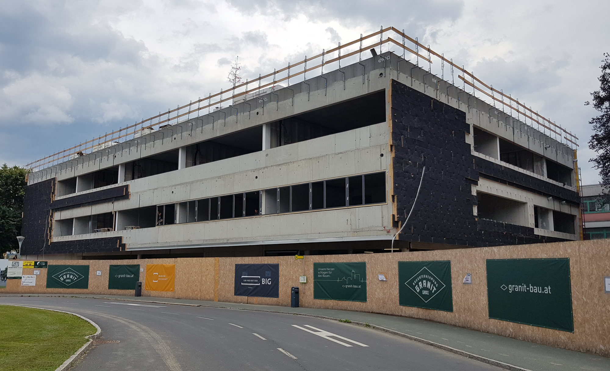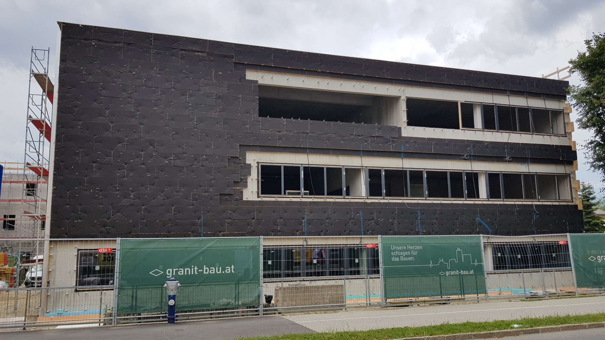 Auf die Betonaußenwände wird mittlerweile die Dämmung aufgebracht und die Türen und Fenster werden eingebaut.