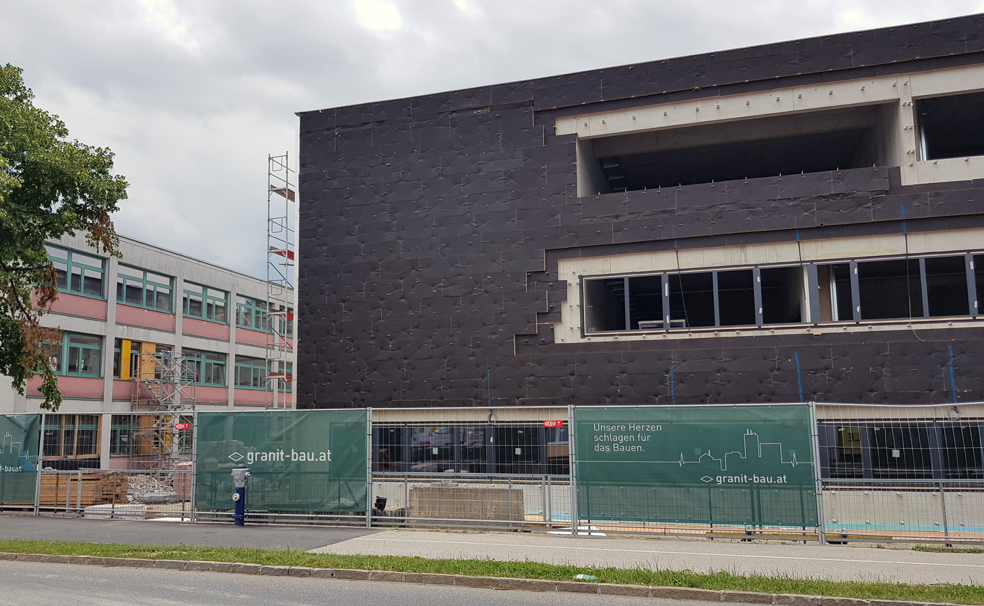 Mitte Juni wurde der große Drehkran demontiert und u.a. ist der Innenausbau des neuen Zubaus der HTL Pinkafeld in vollem Gange.