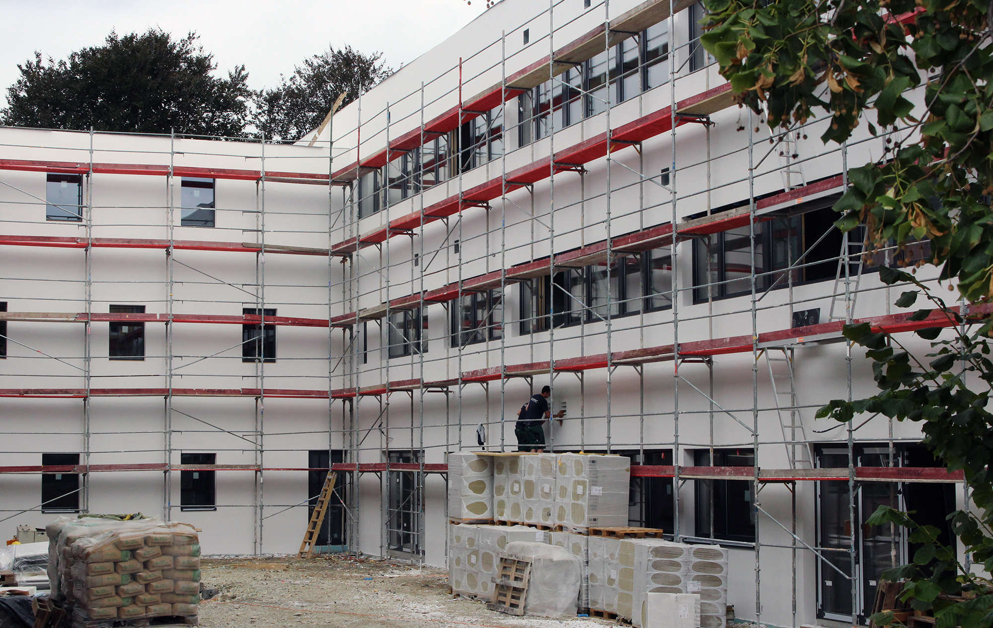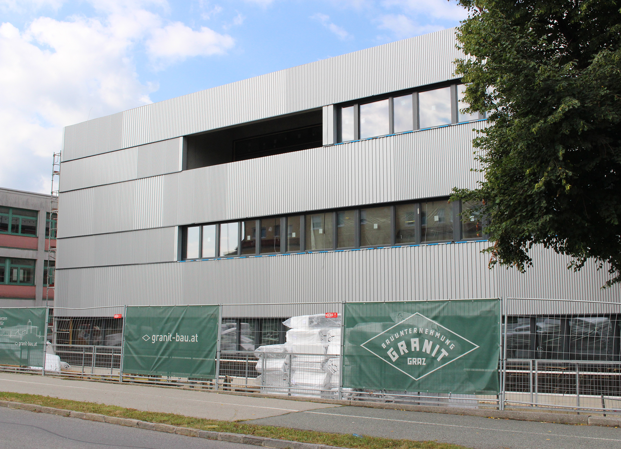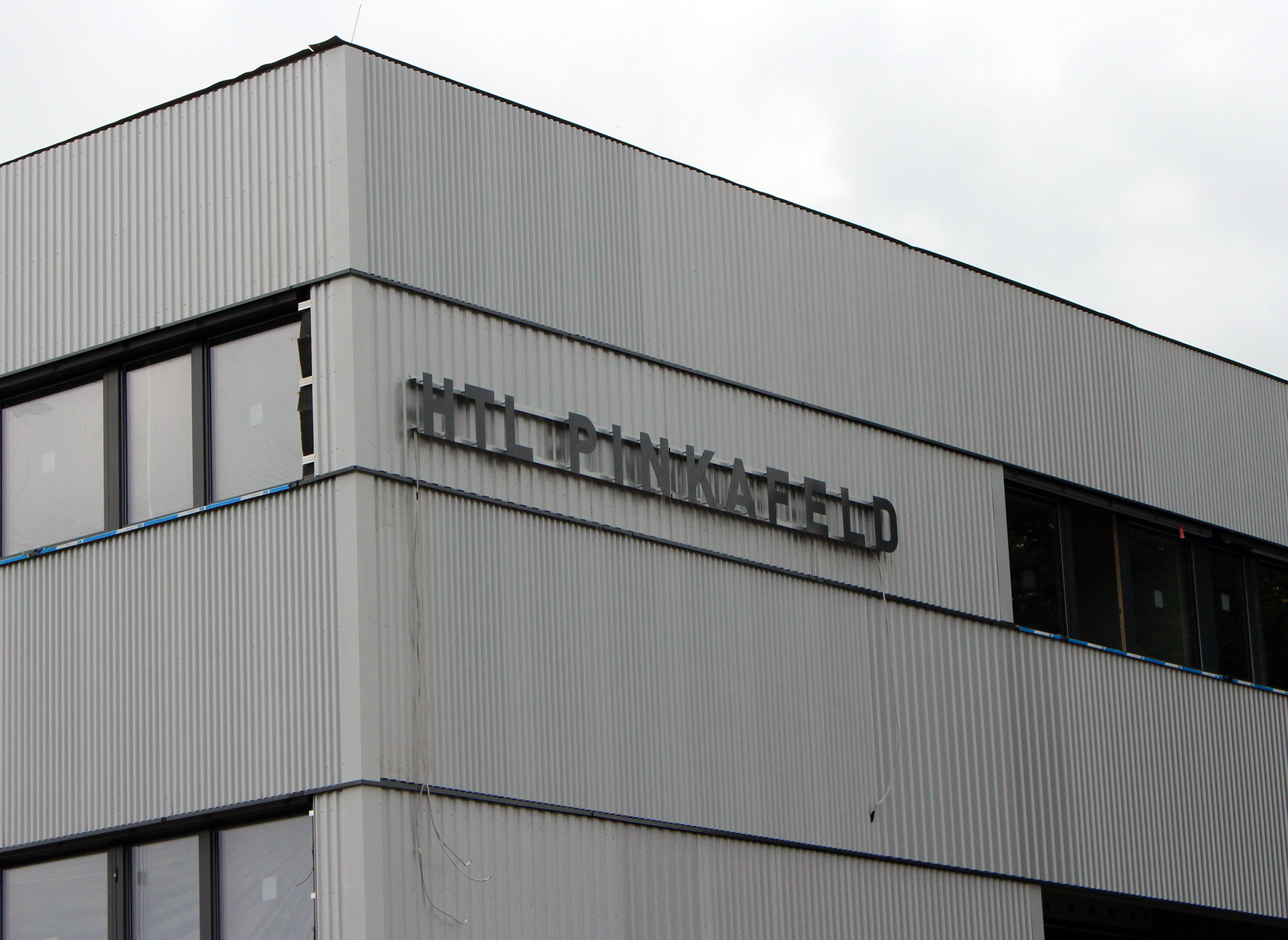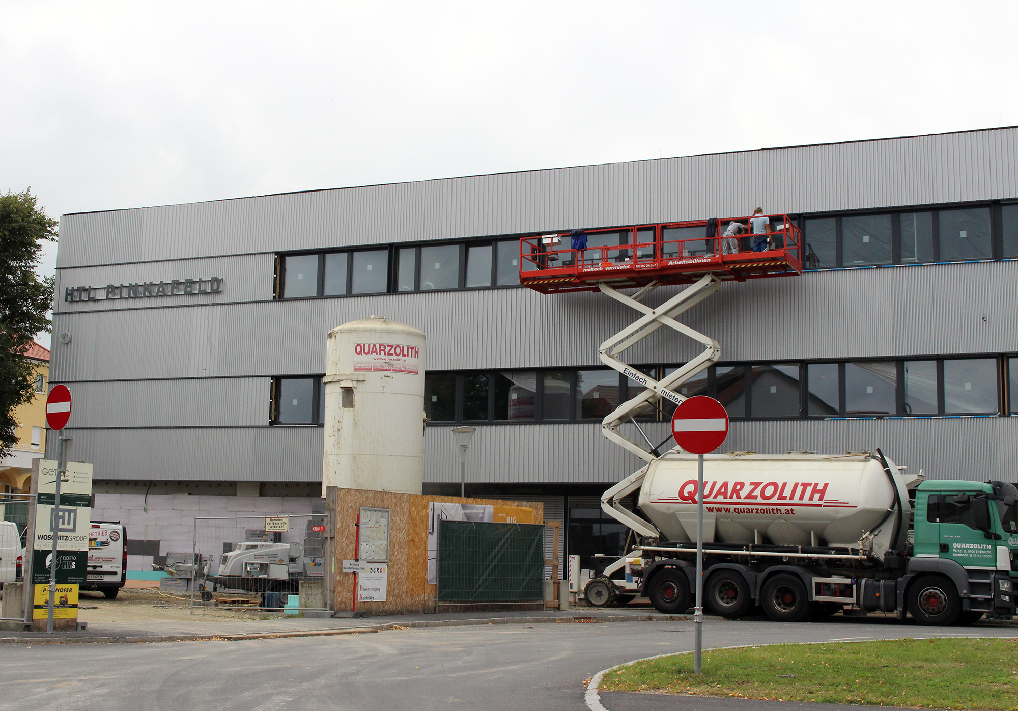 In den Ferien wurden die Arbeiten innen und außen am neuen Zubau der HTL Pinkafeld zügig fortgesetzt. So sind weite Teile der Fassade bereits gedämmt und verblecht bzw. verputzt, auch der Innenausbau schreitet weiter voran.
