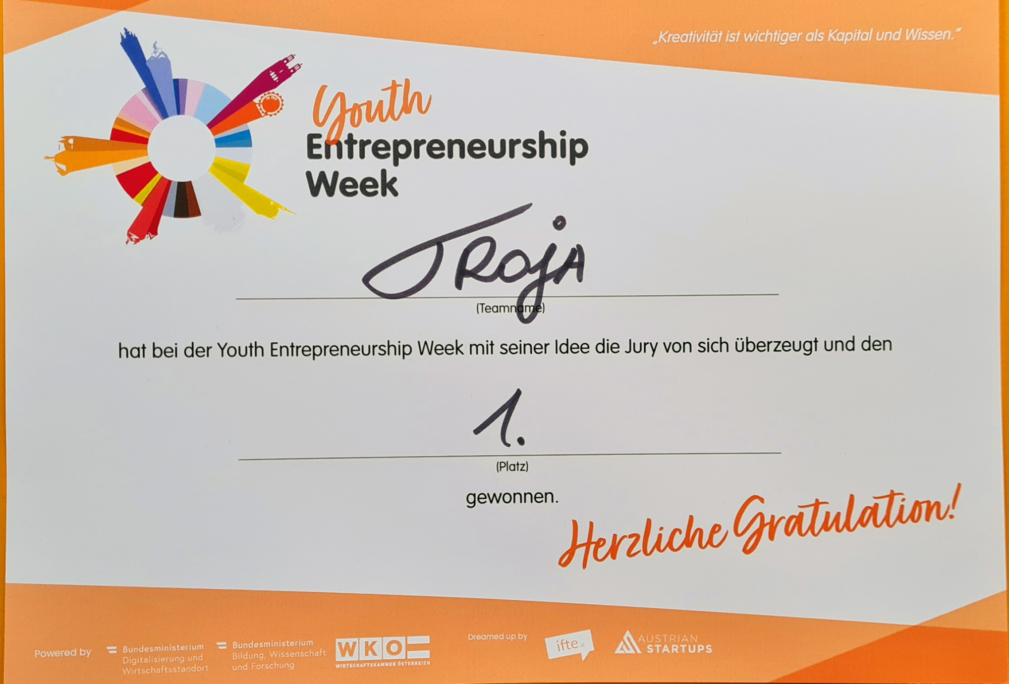 Auf dem ersten Platz landete „Troja Technologies“ (open source tool für Programmierer), Platz 2 und 3 ging ex equo an „Save2drink“ (Aufspüren von KO-Tropfen in Getränken) und „Sportconnect“ (App zum Finden von gleichgesinnten Sportinteressierten).