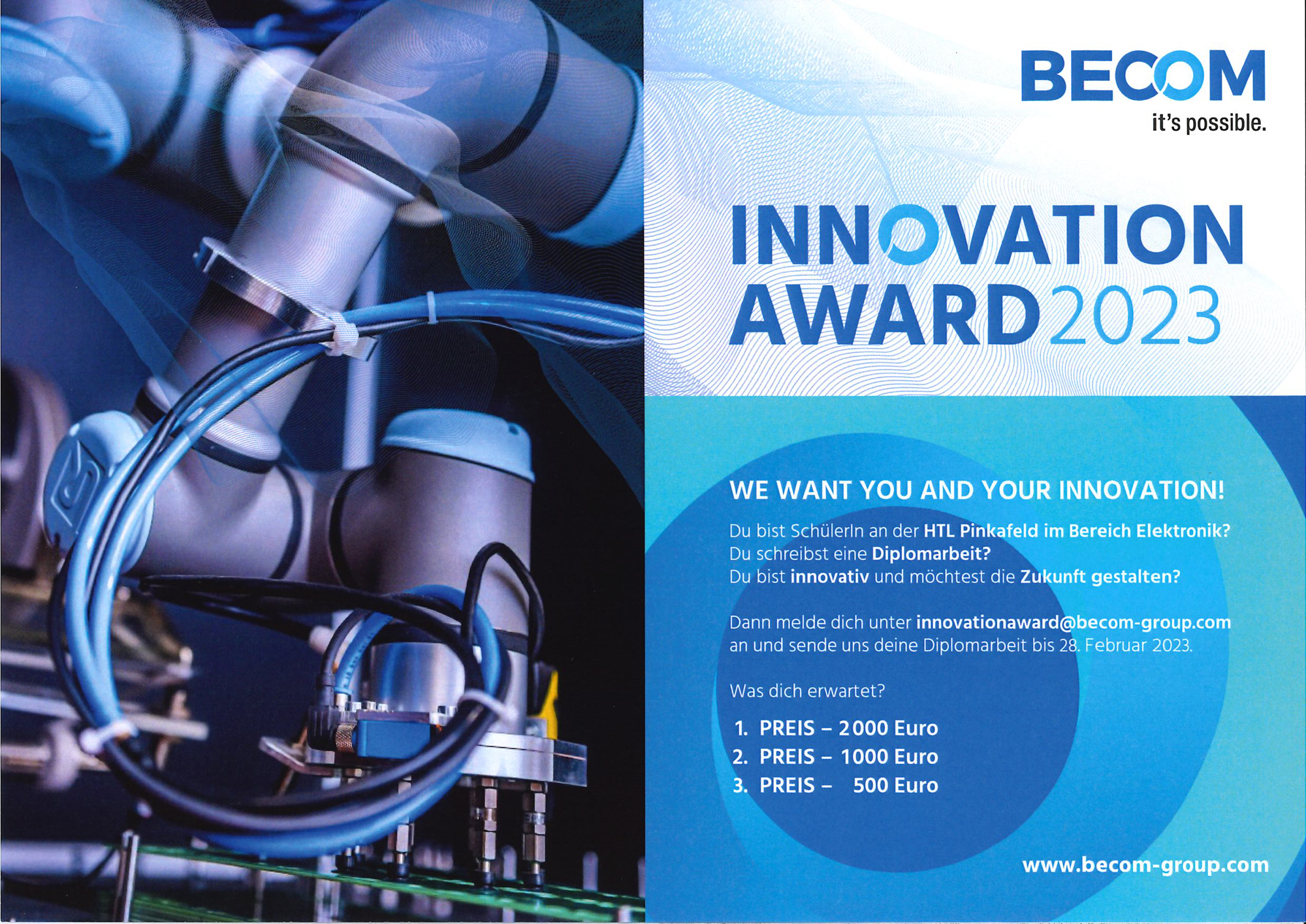 Die im burgenländischen Hochstraß ansässige „BECOM Electronics GmbH“, langjähriger Bildungspartner der Abt. Elektronik und Technische Informatik, schreibt heuer erstmals den „Innovation Award 2023“ aus. Dabei können Schüler*innen der HTL Pinkafeld mit einer besonders innovativen Diplomarbeit Preise im Gesamtwert von € 3.500 gewinnen.