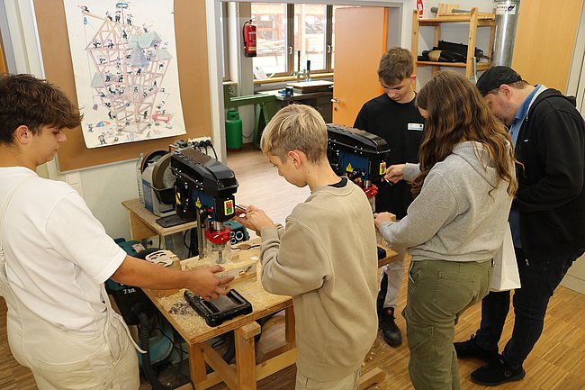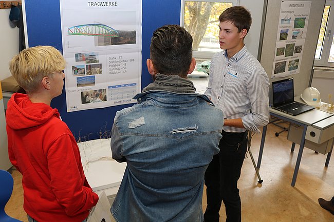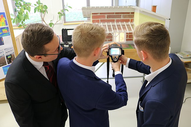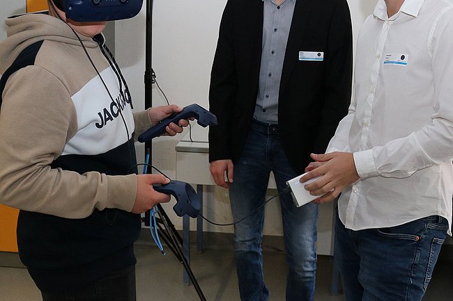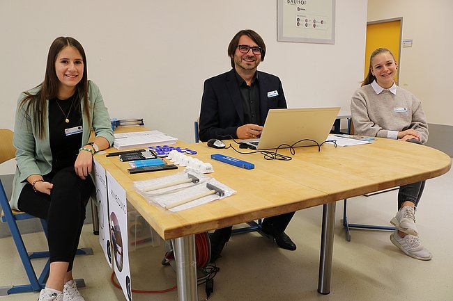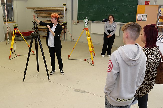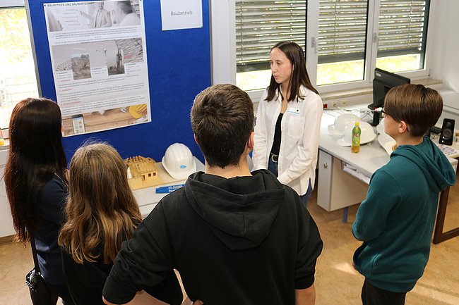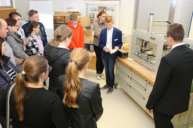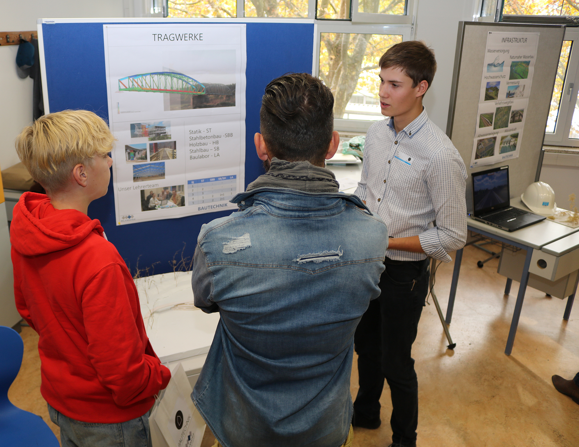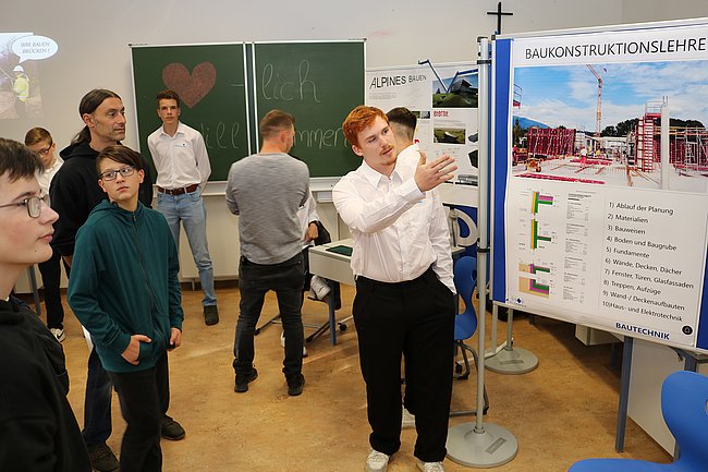 So wurden die verschiedenen Aspekte des Unterrichts anhand der Gegenstände und von Diplomarbeiten erläutert. Im Baulabor wurden Holz- und Betonversuche durchgeführt, die Zukunft des virtuellen Bauens wurde mittels VR-Brille sowie 3D-Scannen und -Drucken demonstriert und die Wärmebildkamera zeigte am Modellhaus sehr anschaulich potentielle Schwachstellen. Wesentliche Teile des fachpraktischen Unterrichts in der Zimmerei und Maurerei konnten am Ende des Rundgangs selbst ausprobiert werden.