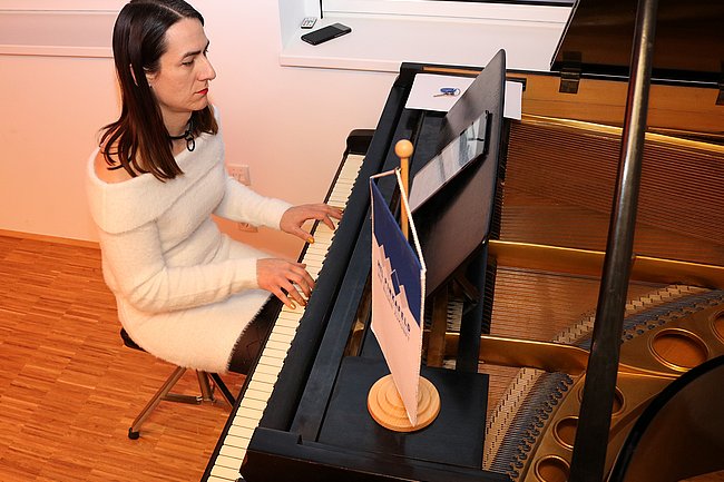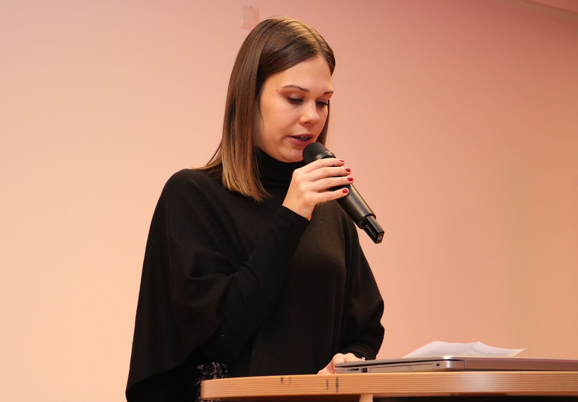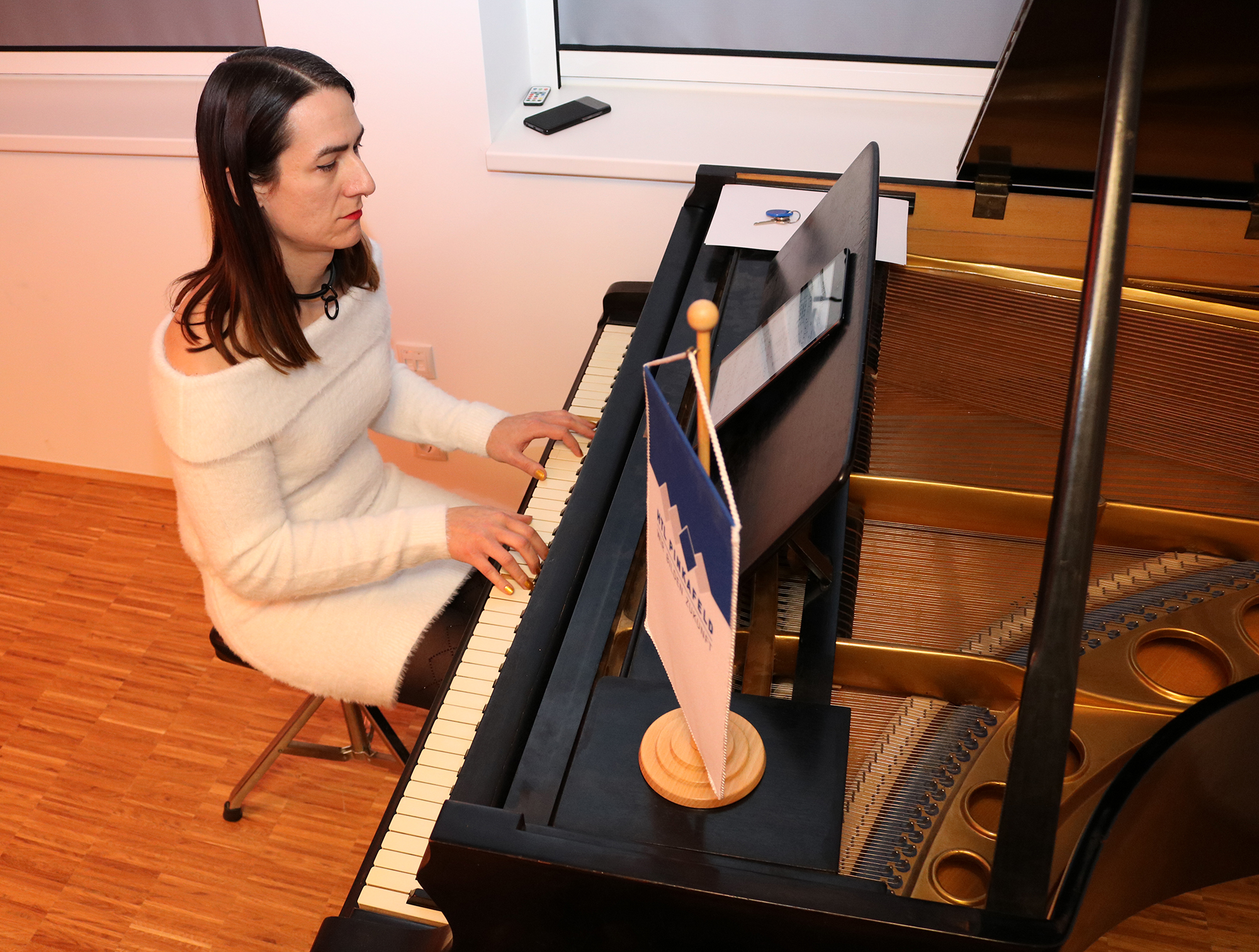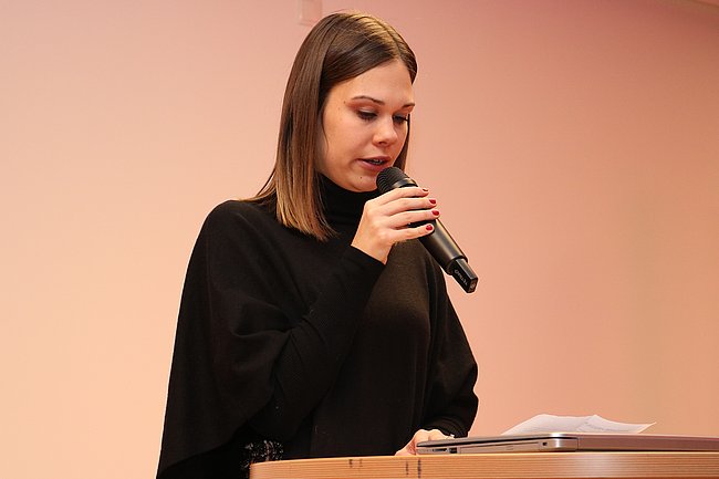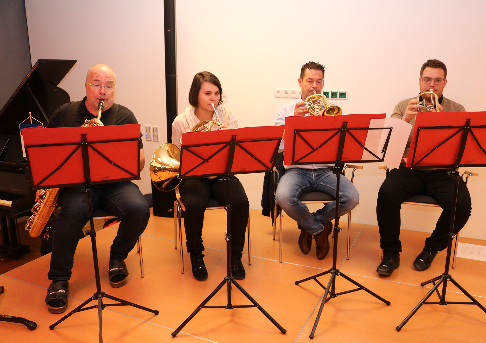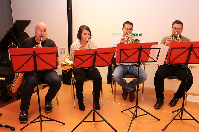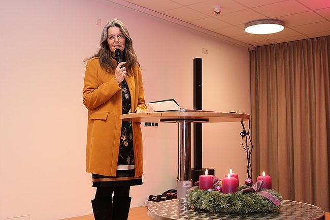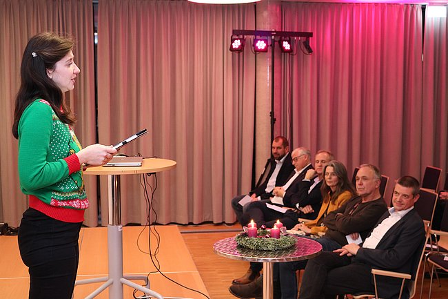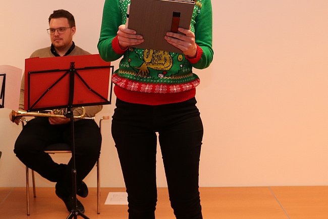 Prof. Judith Pimperl moderierte den besinnlichen Teil, mehrere Lehrer*innen hatten passende Beiträge vorbereitet, ein Lehrer-Bläserensemble unter der Leitung von Prof. Birgit Bergmann sorgte für die musikalische Umrahmung der Feier. Englischassistentin Connor Locke, eine ausgebildete Opernsängerin, beeindruckte– am Klavier begleitet von Prof. Sophie Quaritsch – mit ihrem Vortrag des traditionellen amerikanischen Weihnachtslieds „In the bleak Midwinter“.