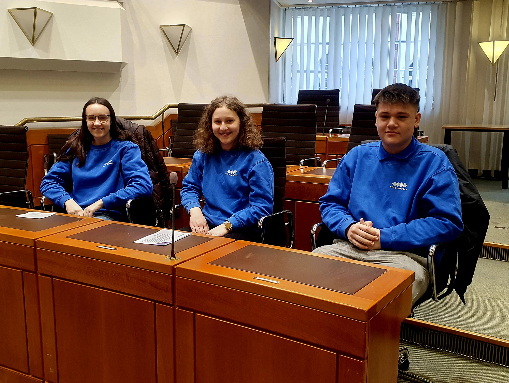 Clara Buchegger, Felix Knabel und Helena Lorenschitz präsentierten ihre Ausarbeitungen und Ideen im Landtagssitzungssaal in Eisenstadt und übergaben in Begleitung der Professorinnen Birgit Stephan und Judith Fenz ihren Klimavertrag an Landeshauptmann-Stv. Astrid Eisenkopf. Die Vorschläge der Schülerinnen und Schüler werden Teil der burgenländischen Nachhaltigkeitsziele sein.