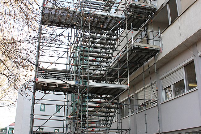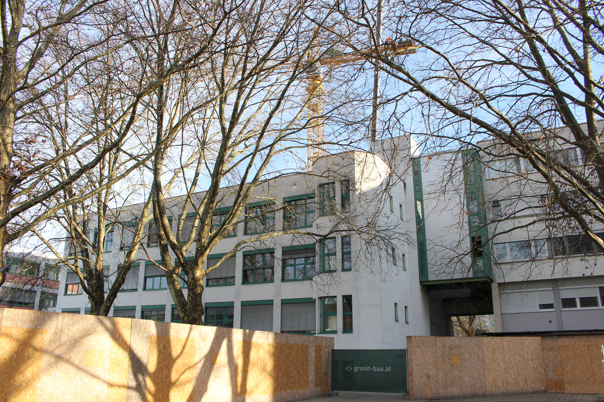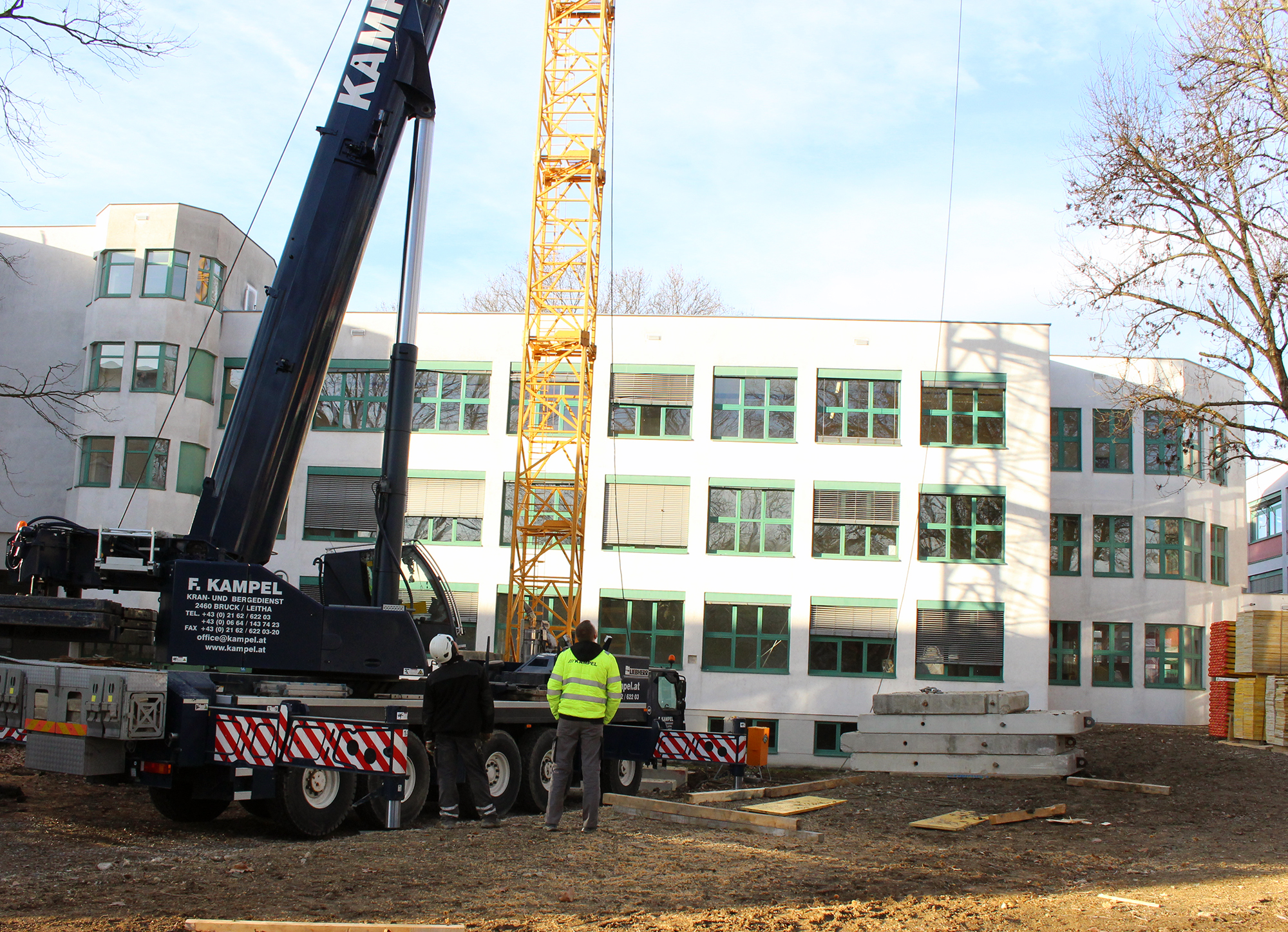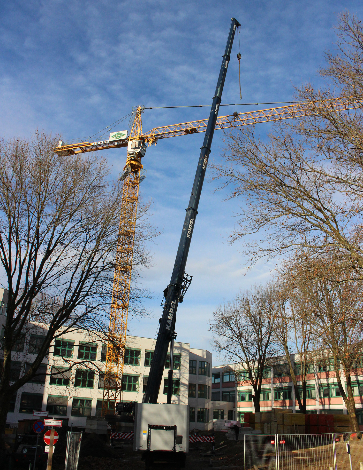 Dafür wurden in den letzten Tagen u.a. der Baustellenbereich verlegt, ein großer Drehturmkran in Betrieb genommen und eine Notfalltreppe für den als Ausweichquartier fungierenden Internatstrakt errichtet.