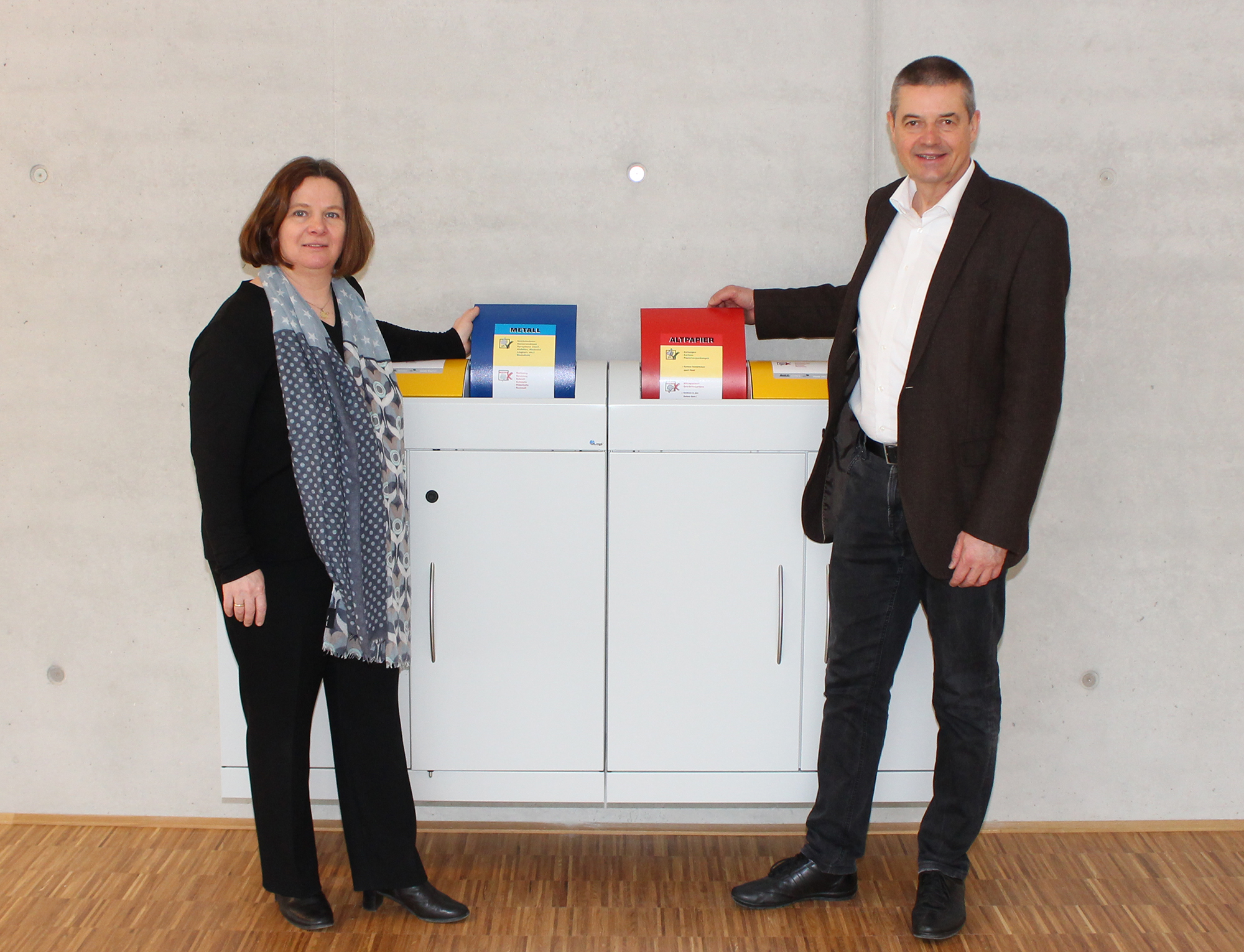 Der Elternverein unterstützt diese Bemühungen der Schulleitung und hat für das neue Eingangsgebäude einen Teil der Wertstoffsammler finanziert, damit einerseits keine Wertstoffe verschwendet werden und andererseits die Schüler*innen eine saubere Schulumgebung vorfinden. Nach den Semesterferien konnte Dir. Wilfried Lercher von Elternvereinsobfrau Mag. Gabriele Pickl-Pratscher die letzte Sammelstelle persönlich in Empfang nehmen.