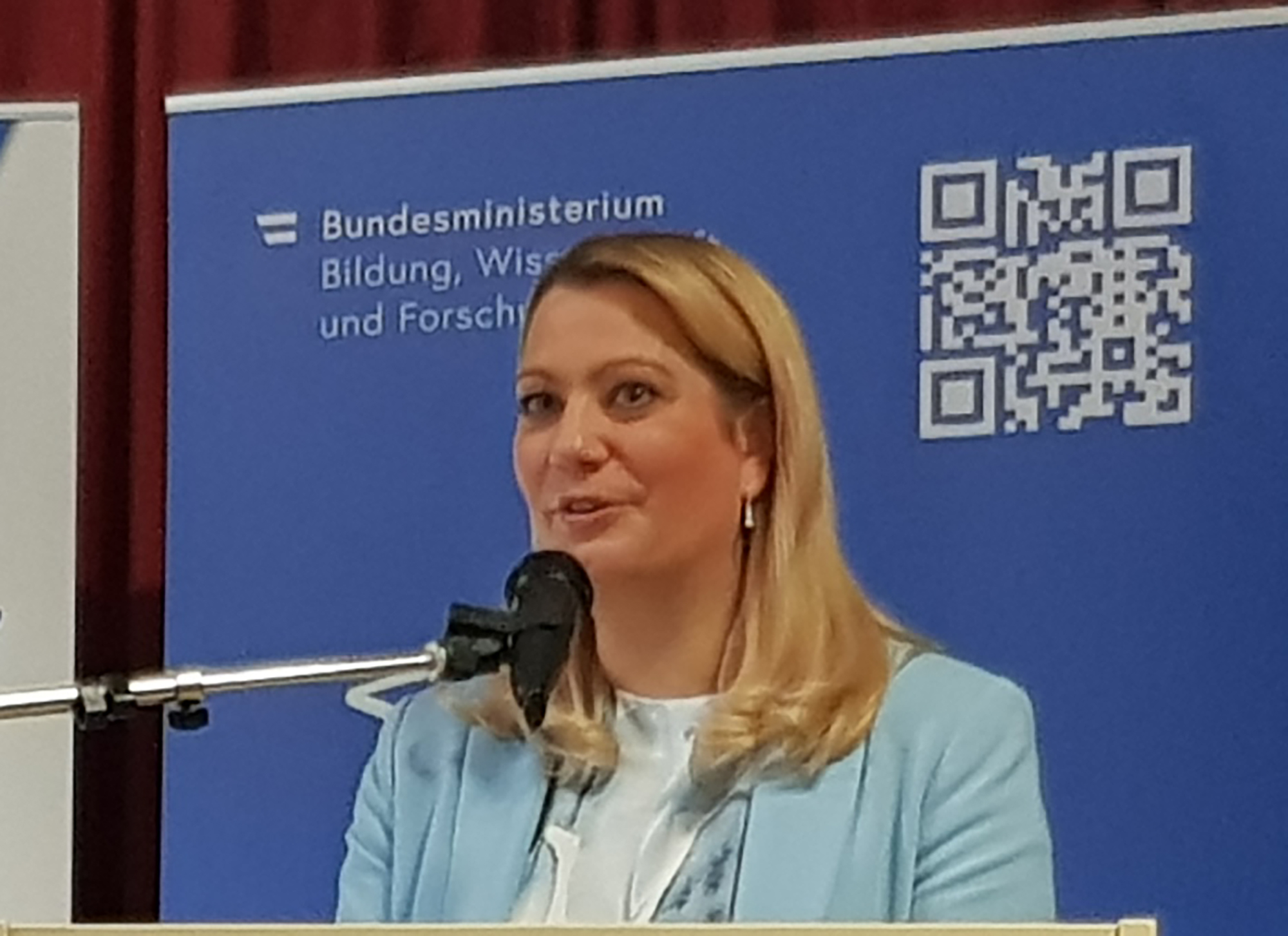 Bildungslandesrätin Daniela Winkler betonte in ihren Grußworten die große Bedeutung der Übungsfirmen, um wirtschaftliche Abläufe auch schon in der Schule praktisch kennenlernen zu können und motivierte die Schüler*innen, diese Möglichkeit gut zu nutzen.