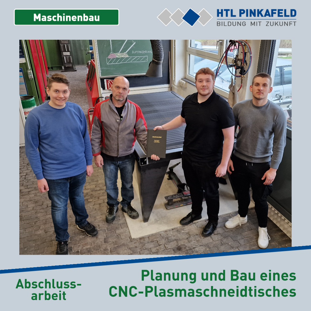 Im Rahmen der Maschinenbau-Abschlussarbeit von Deniz Homoras, Florian Mayer und Vladislav Dorogan wurde ein CNC-Plasmaschneidtisch konstruiert und gebaut. Dieser Tisch soll im Schweißtechnik-Unterricht Verwendung finden und Arbeitsabläufe in der Werkstätte verbessern und optimieren helfen. Betreut wurde die Arbeit von BEd Werner Moser.