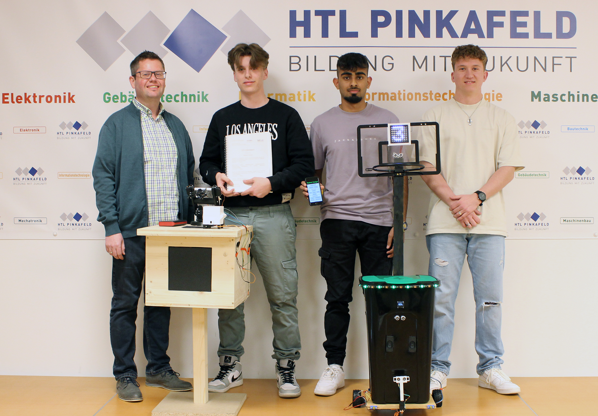 Im Zuge der Diplomarbeit „Basket Gadget“ wurde ein handelsüblicher Papierkorb zu einem interaktiven Gadget mit innovativen Funktionen umgebaut. Umgesetzt wurde das Projekt von den Elektronik-Maturanten Jonas Kuch, Mani Kumar und Mario Hatzl, wobei die Betreuung durch Prof. Robert Pöttler erfolgte. Die offizielle Übergabe an den Auftraggeber HTL Pinkafeld erfolgte Anfang April.