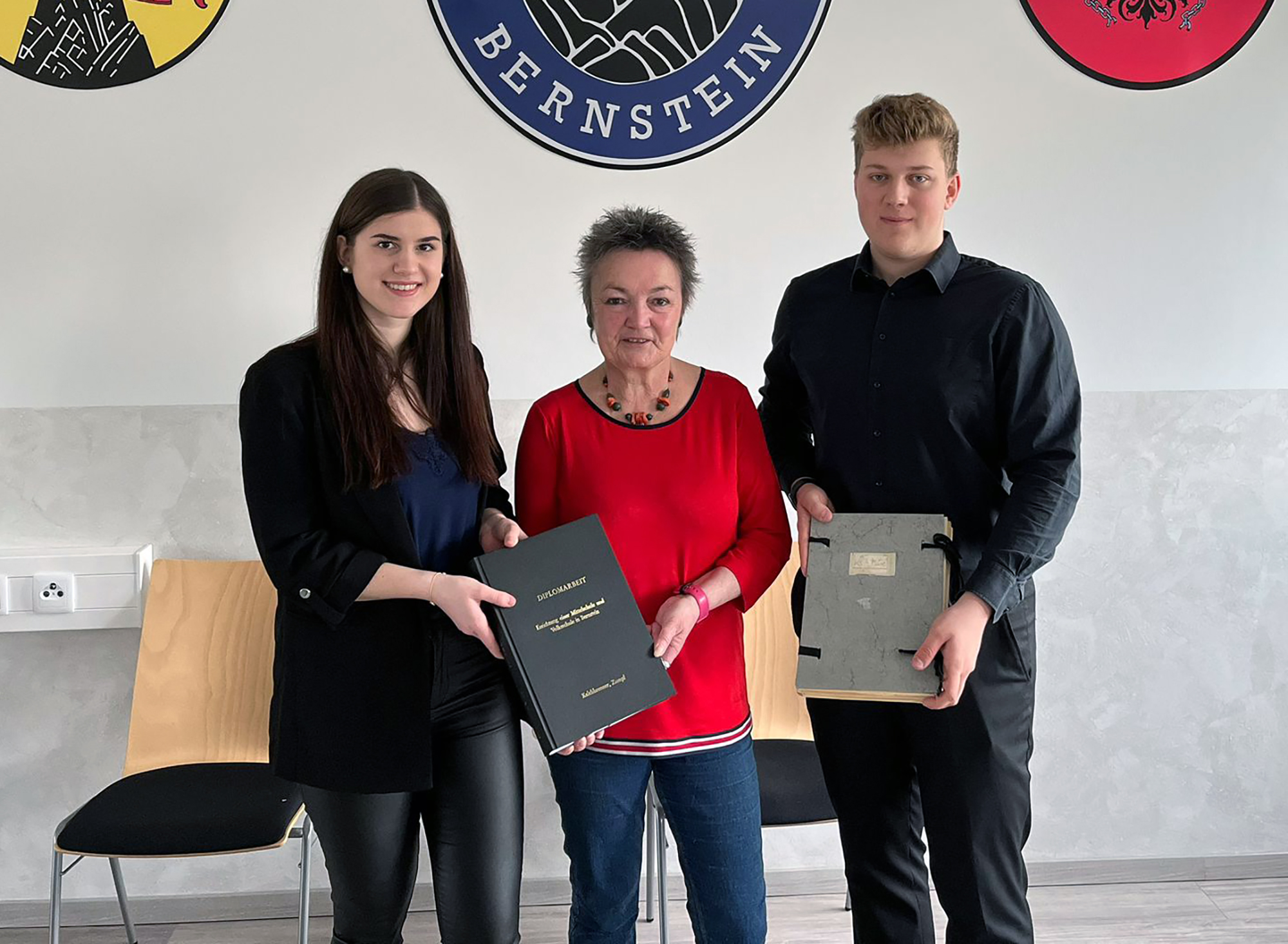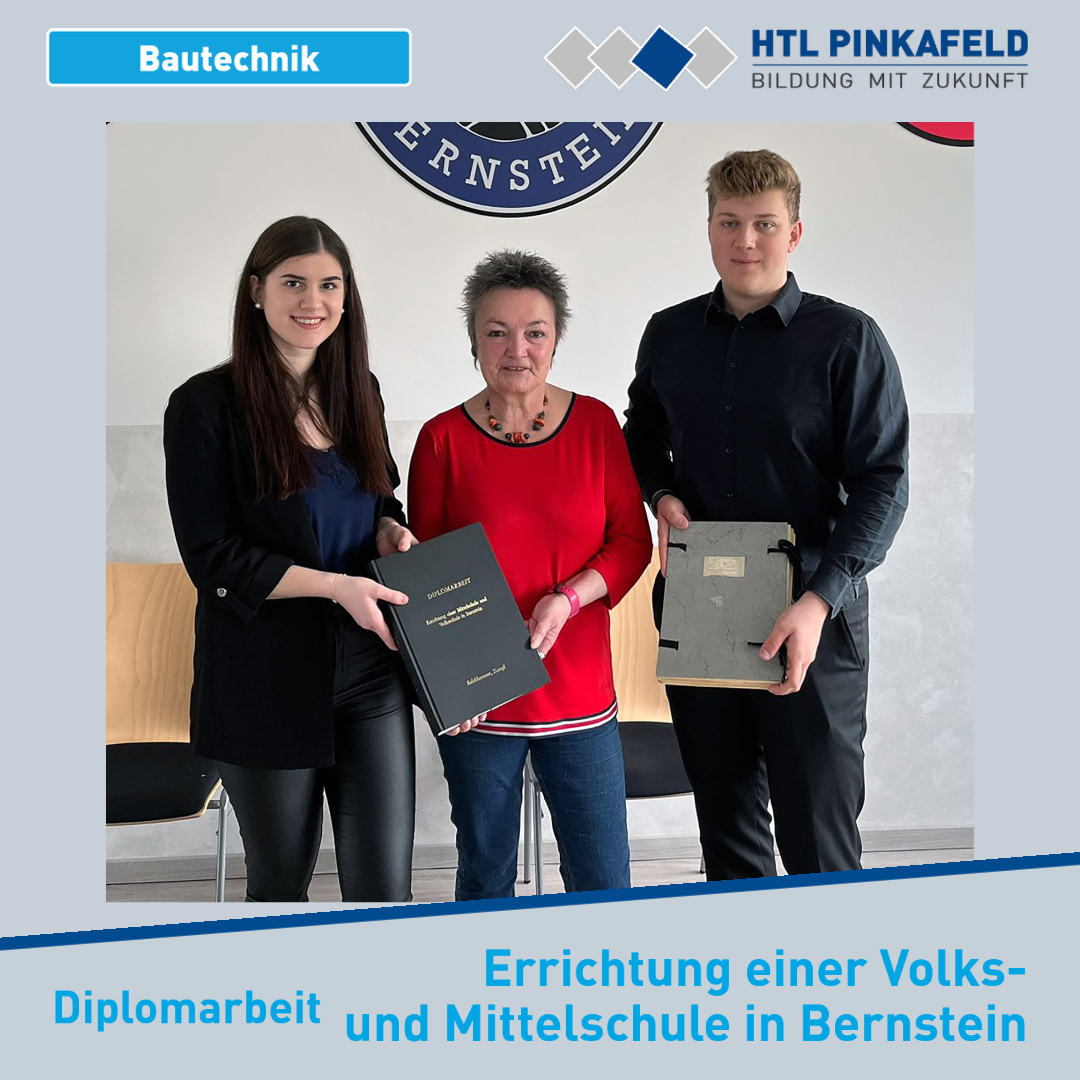 Anfang April wurde die Diplomarbeit „Errichtung einer Volksschule und Mittelschule in Bernstein“ von den Bautechnik Maturanten Christina Kalchbrenner und Maximilian Zumpf an die Bürgermeisterin der Martkgemeinde Bernstein Renate Habetler übergeben.