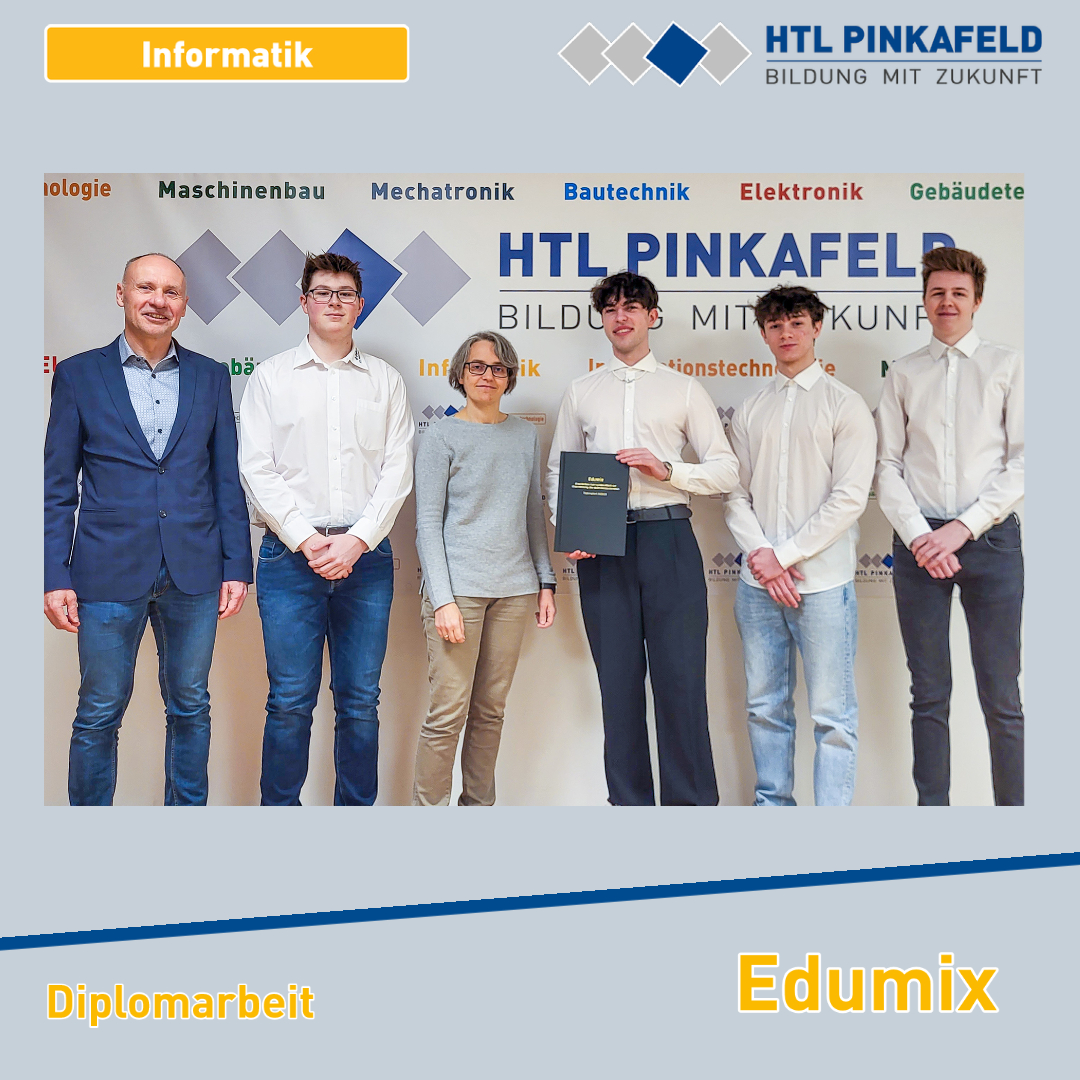 Kürzlich wurde die Informatik-Diplomarbeit „edumix”, eine von den Maturanten Joshua Burits, Sebastian Fleck, Maximilian Hasler und Jakob Heiling entwickelte erweiterbare Lernspielplattform, an den Auftraggeber HTL Pinkafeld übergeben. Betreut wurde diese Diplomarbeit von Prof. Sophie Quaritsch und Prof. Gerhard Posch.