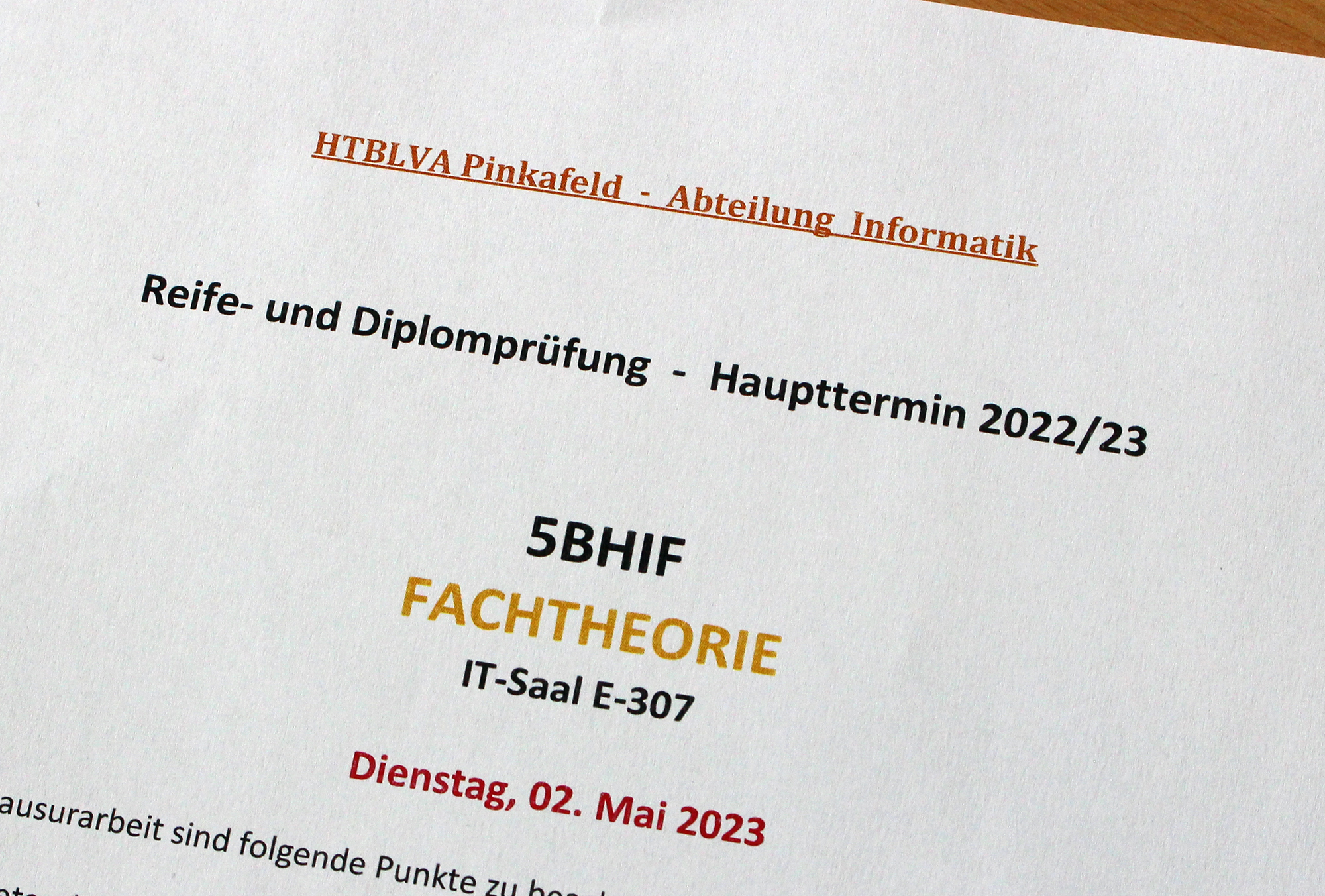 Mit den nichtstandardisierten Fachklausuren und Abschlussprüfungen in Bautechnik, Elektronik, Gebäudetechnik, Informatik und Maschinenbau haben die abschließenden schriftlichen Prüfungen des Reife- und Diplomprüfungshaupttermins 2023 am 2. Mai – hoffentlich gut! – begonnen. Die standardisierten Klausuren in Angewandter Mathematik folgen morgen Mittwoch, Deutsch steht am Freitag auf dem Programm und Englisch bildet nächsten Dienstag den Abschluss.