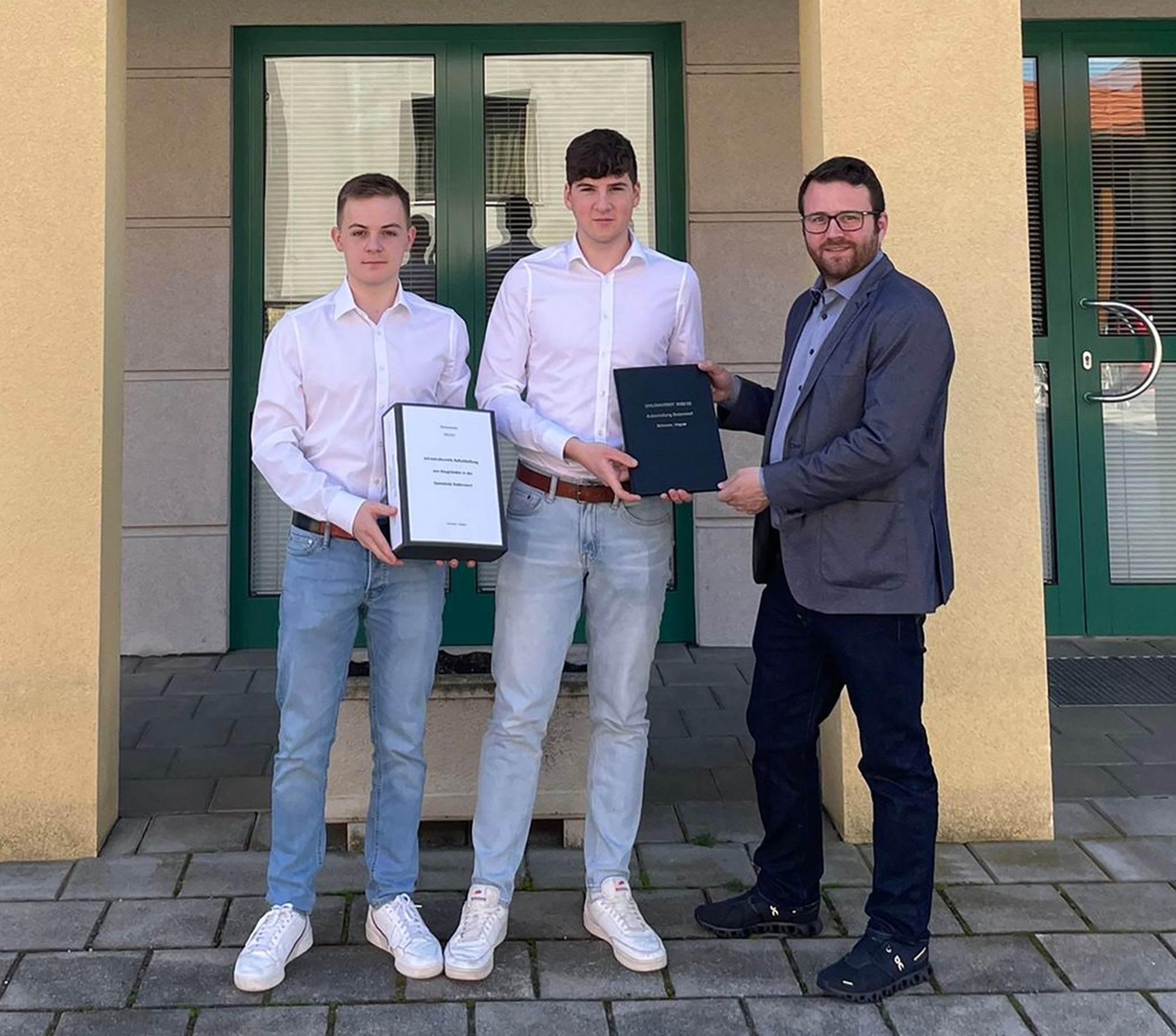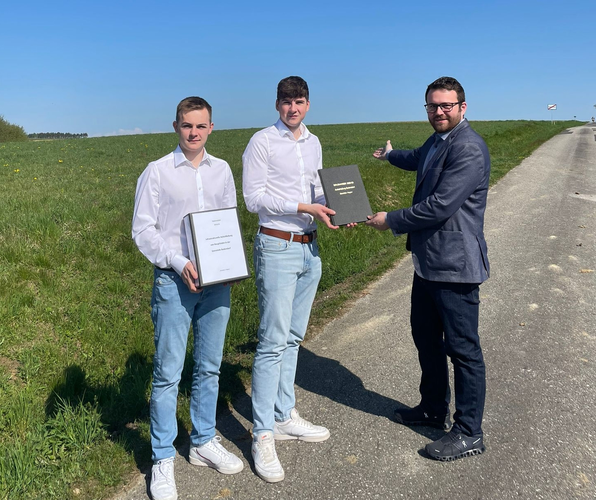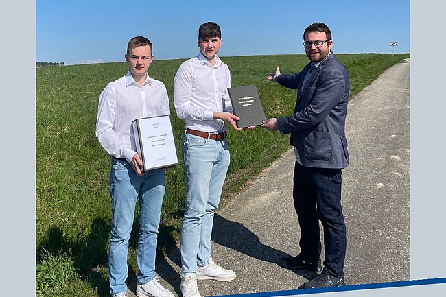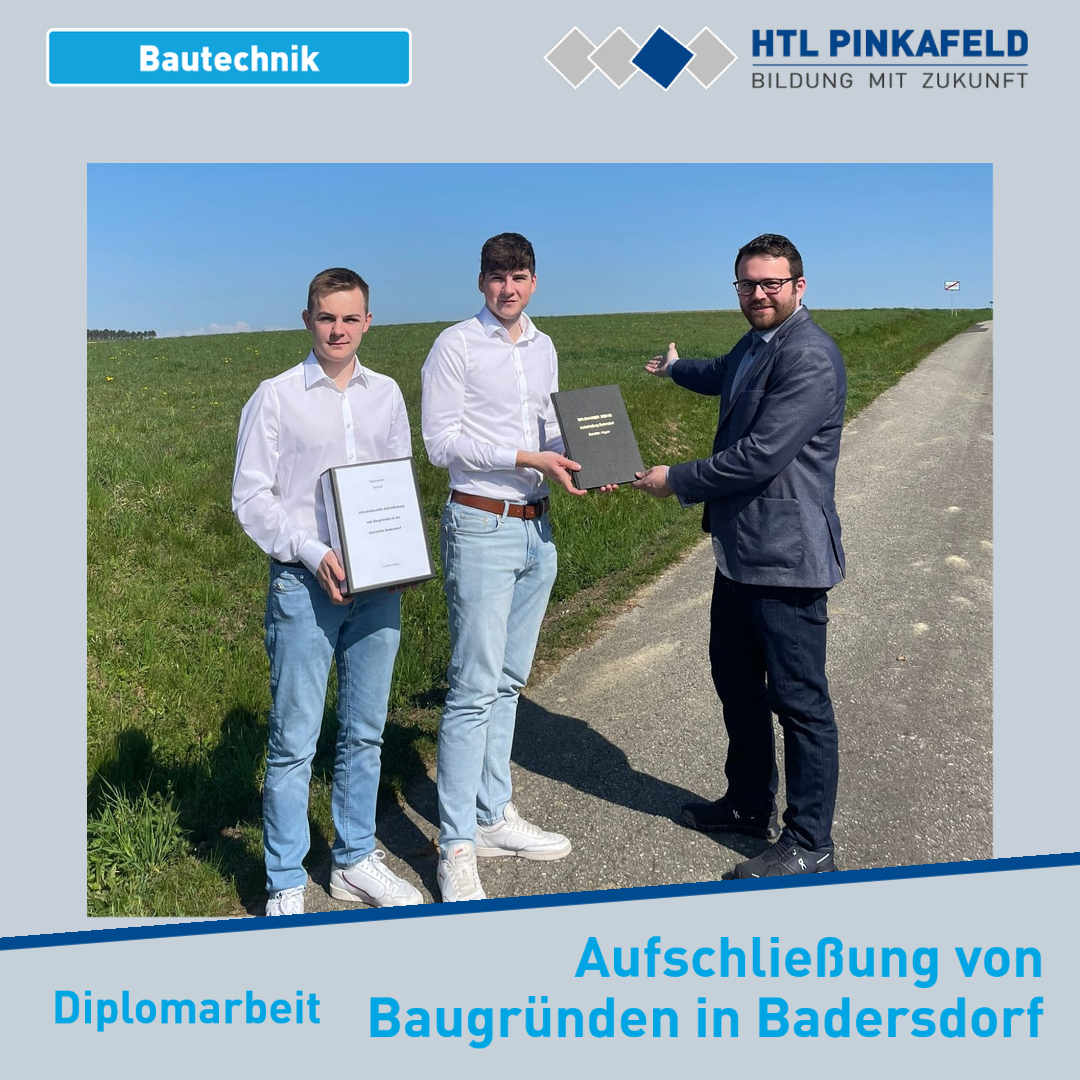 Nach Fertigstellung der Bautechnik-Diplomarbeit „Infrastrukturelle Aufschließung von Baugründen in der Gemeinde Badersdorf“ wurde das Ergebnis von den Maturanten Fabian Schneider und Lukas Wagner an den Auftraggeber, Bürgermeister Daniel Ziniel übergeben. Betreut wurde die Diplomarbeit von Prof. Oskar Hable und Prof. Johannes Feichtinger.