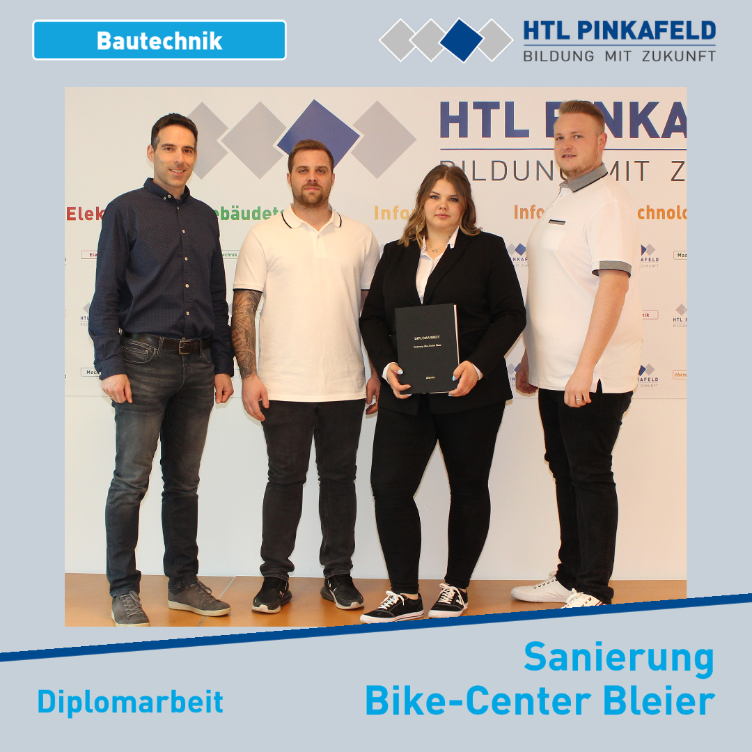 Ende März wurde die Diplomarbeit „Sanierung Bike-Center-Bleier“ von der Maturanten des Bautechnik-Tageskollegs Sarah Sabatka, Hans Jürgen Mauerhofer und Philipp Wagner fertiggestellt. Die Betreuung erfolgte durch Prof. Hans Glatz.