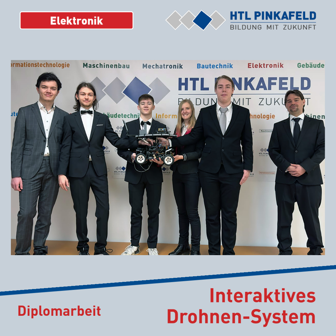 Kürzlich wurde die Diplomarbeit „Interaktives Drohnen-System“ von den Elektronik-Maturanten Lukas Berger, Vanessa Glatz, Jan Mikikits, Simon Stimpfl und András Szabolcs an den Auftraggeber HTL Pinkafeld übergeben. Betreut wurde diese Diplomarbeit von Prof. Alexander Isop.