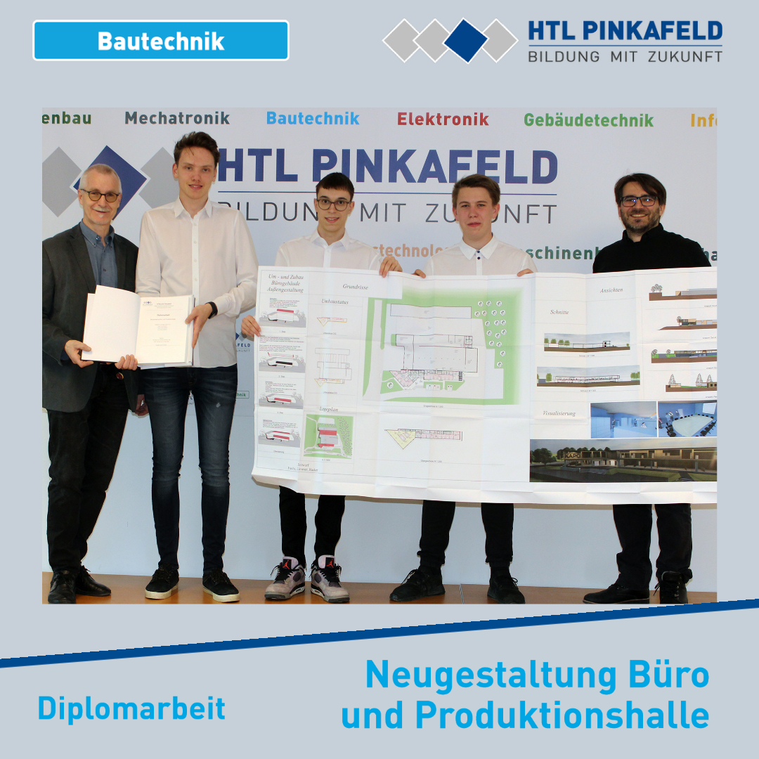 Kürzlich wurde die Diplomarbeit „Neugestaltung Büro und Produktionshalle“ von den Bautechnik-Maturanten Julian Fuchs, Tobias Limmer und Leon Hacker an die Fa. Kapo Fenster und Türen GmbH in Pöllau übergeben. Betreut wurde die Arbeit von Prof. Christoph Schermann und Prof. Peter Derler.