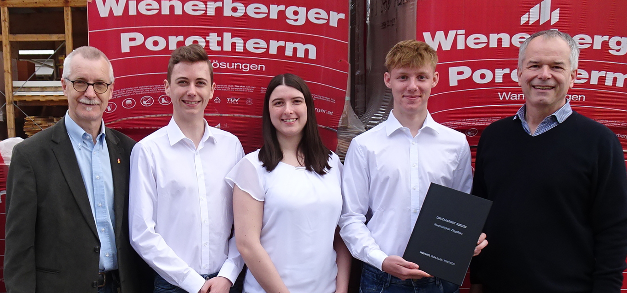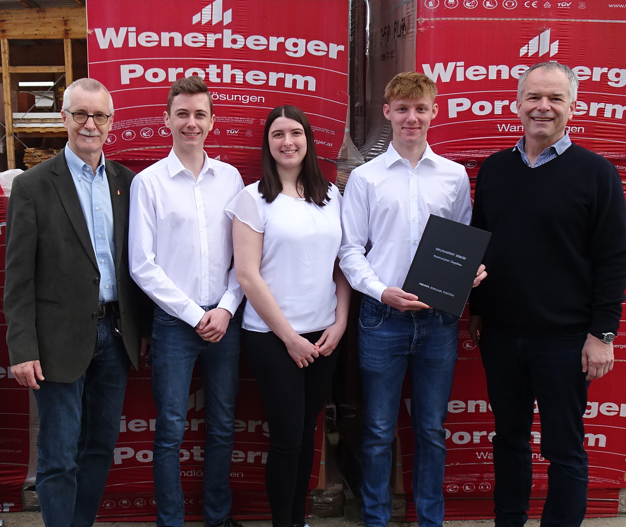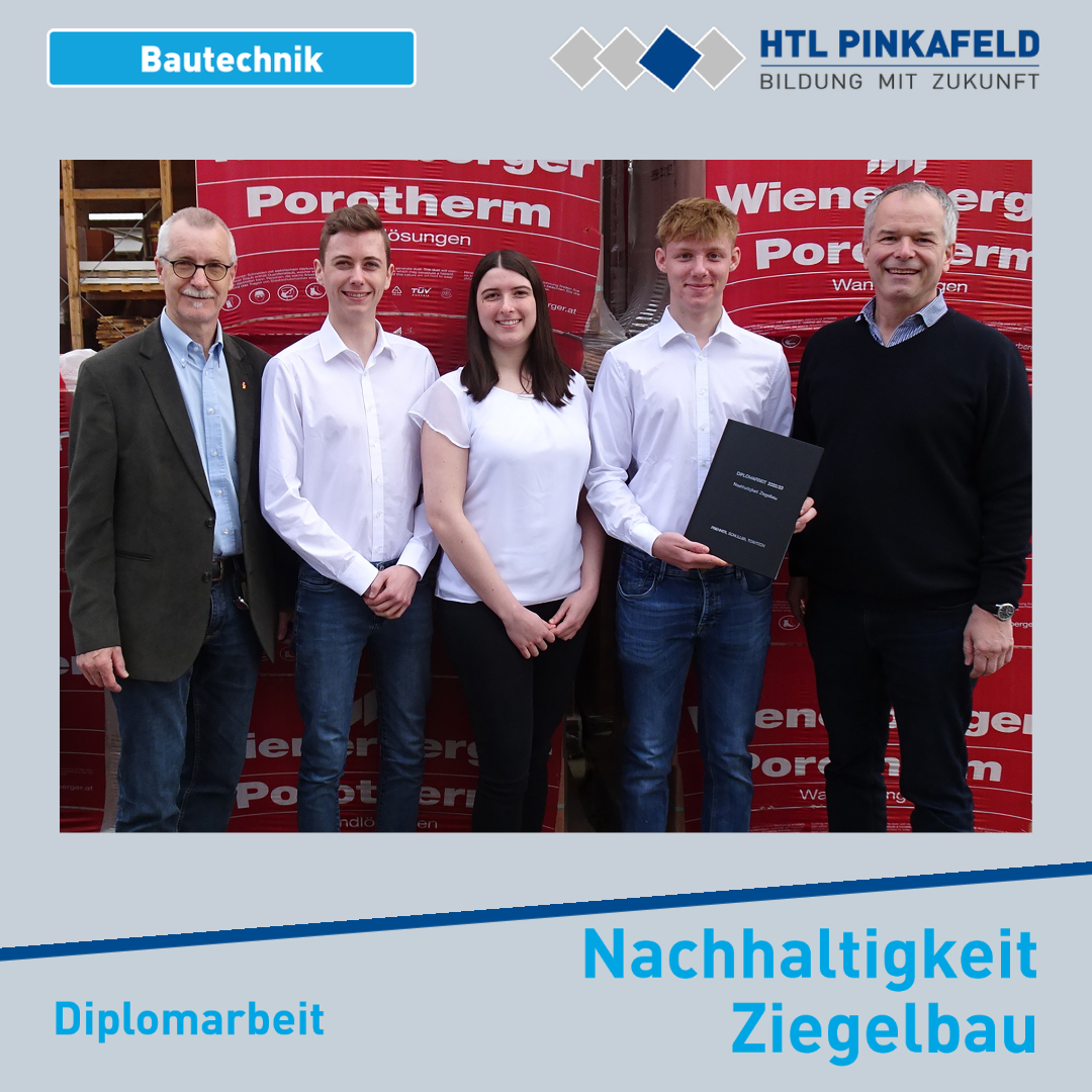 Ende April wurde die Diplomarbeit „Nachhaltigkeit Ziegelbau“ von den Bautechnik-Maturanten Clemens Prenner, Anja Schuller und Jonas Tobitsch an den Leiter der Produktentwicklung und Anwendungstechnik der Firma Wienerberger, Herrn Dipl.-Ing. Mario Kubista übergeben. Betreut wurde die Arbeit von OStR Peter Derler.