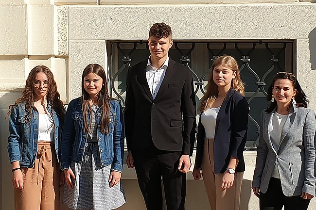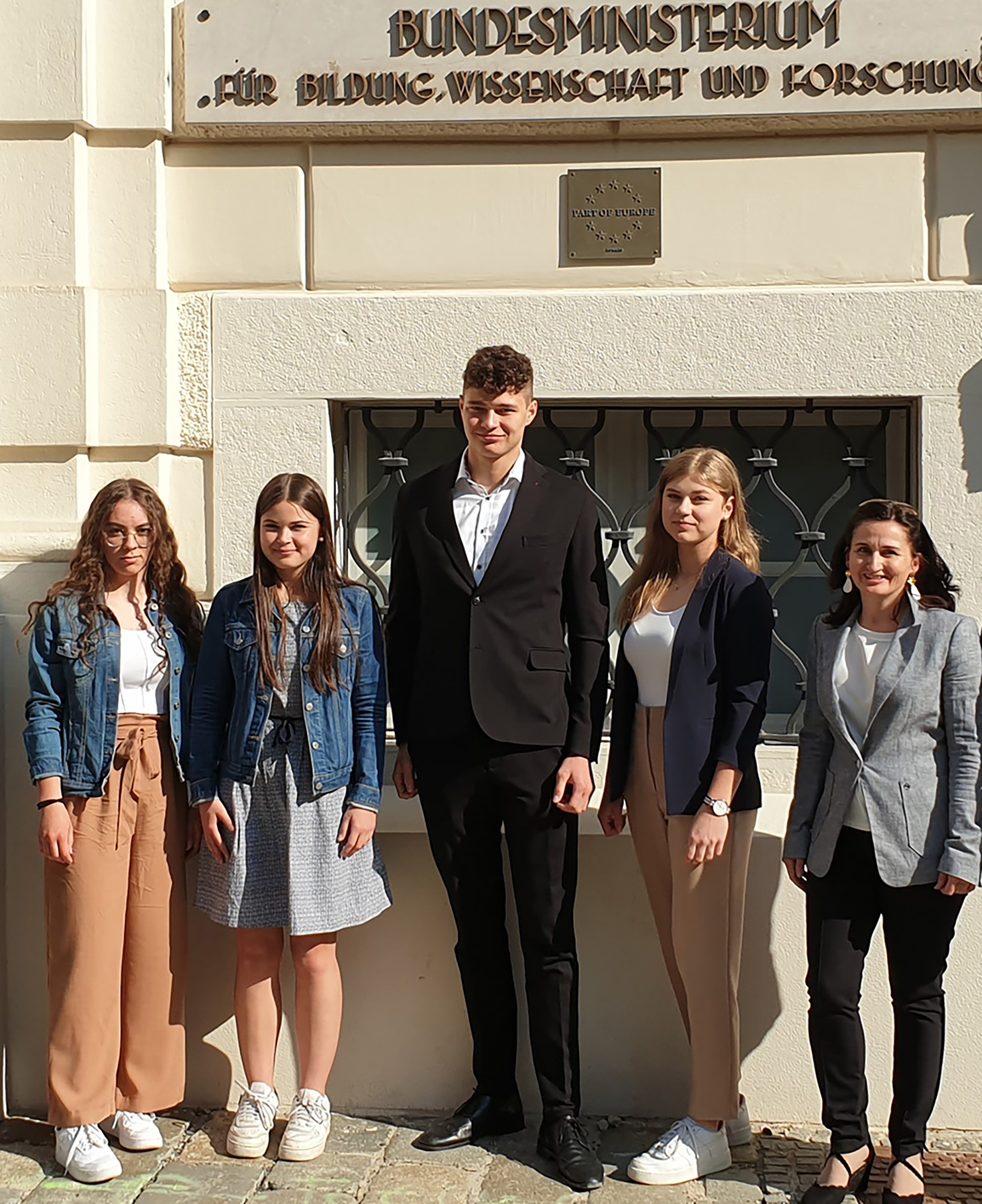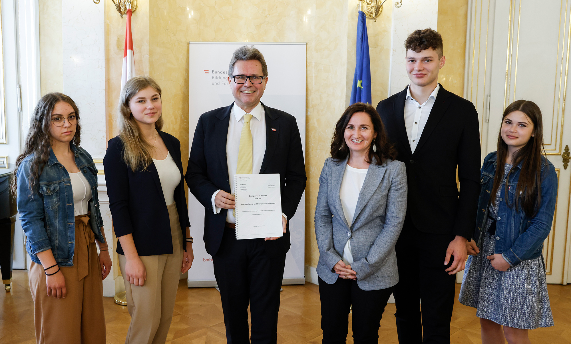 Am 15. Juni 2023 lud Bundesminister Dr. Martin Polaschek die vierköpfige HTL-Projektgruppe Magdalena Baldauf, Rebekka Reithmeier, Felix Ulreich und Theresa Zink in Begleitung von Prof. Judith Fenz zur Urkundenüberreichung für das interdisziplinär durchgeführte BMBWF-Projekt „Energieeffizienz- und Energiesparmaßnahmen“ in das Bildungsministerium nach Wien ein. Mit dabei war auch eine weitere Projektgruppe der HTL Mödling.