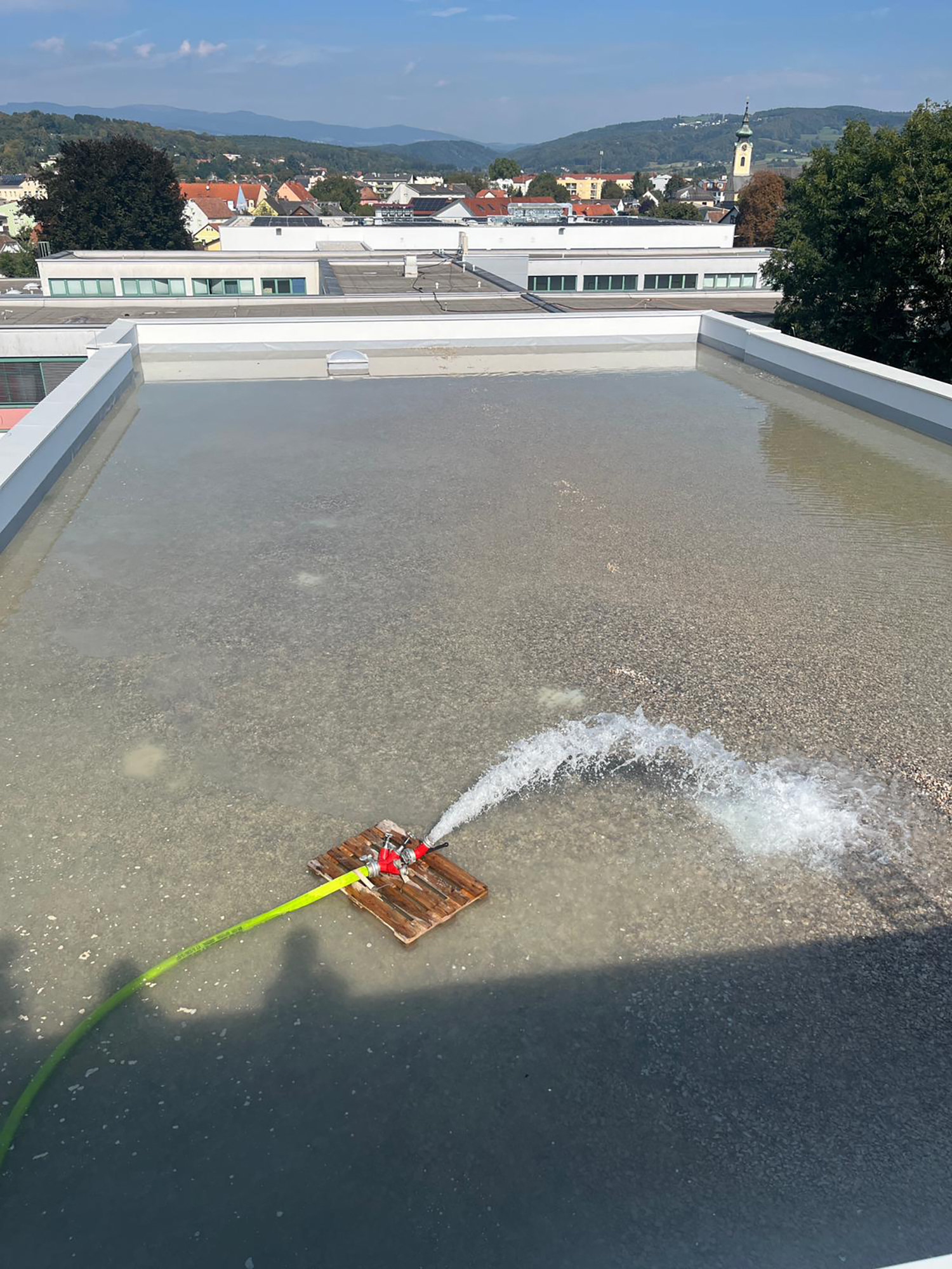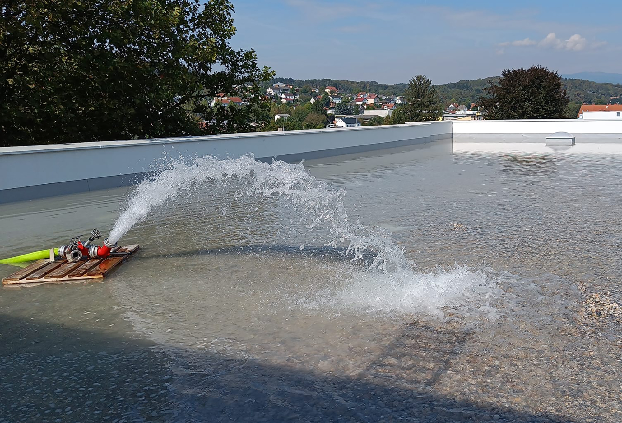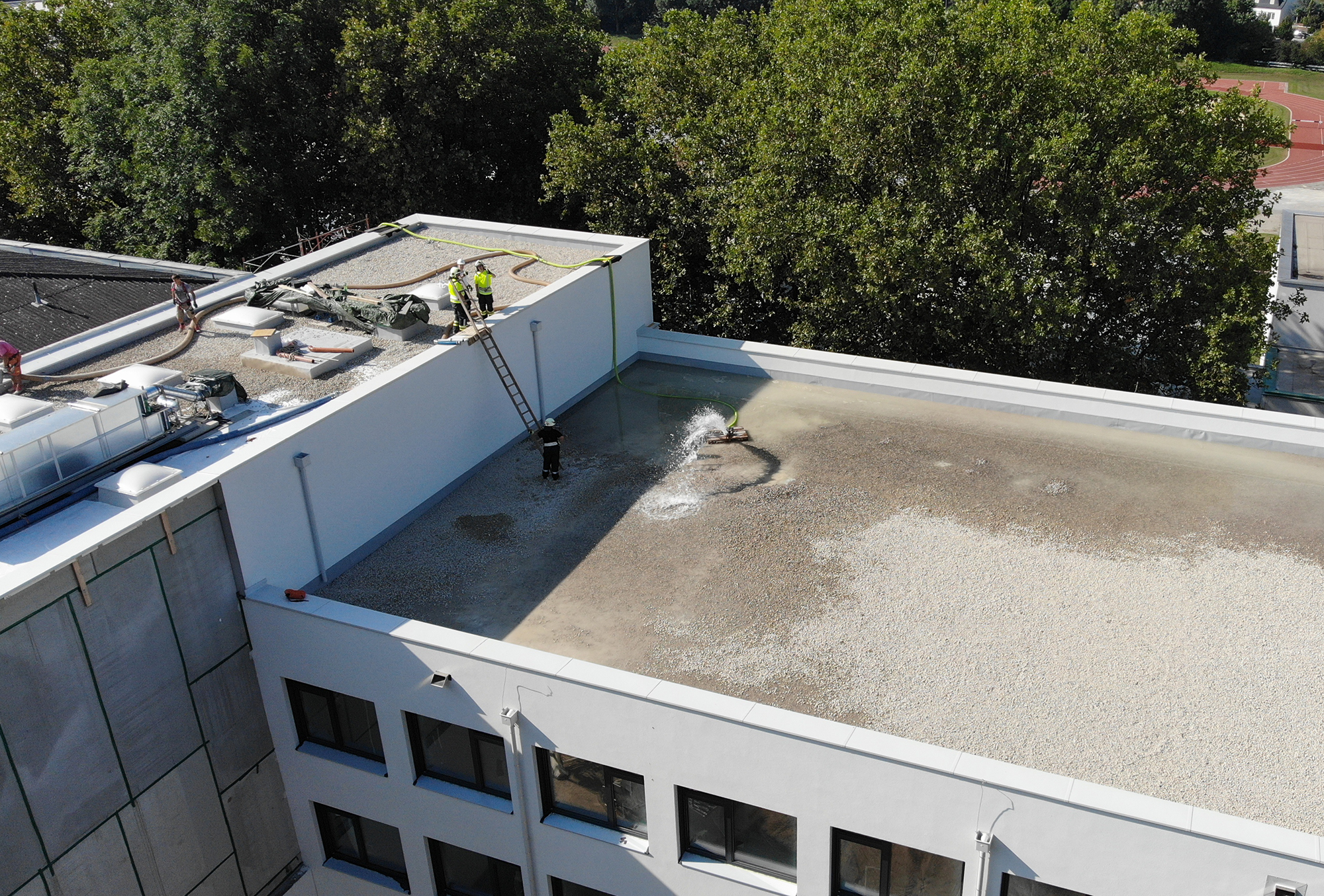 In Kooperation mit der Stadtfeuerwehr Pinkafeld wurde ein Wassertransport für eine Dichtheitsprobe des neuen Flachdachs durchgeführt. Nach einer umfangreichen Baustellenunterweisung durch den Polier wurde mit dem Aufbau einer Transportleitung begonnen. In einer Zeit von zwei Stunden wurde die stattliche Wassermenge von 90 m³ auf das Dach gefördert.
