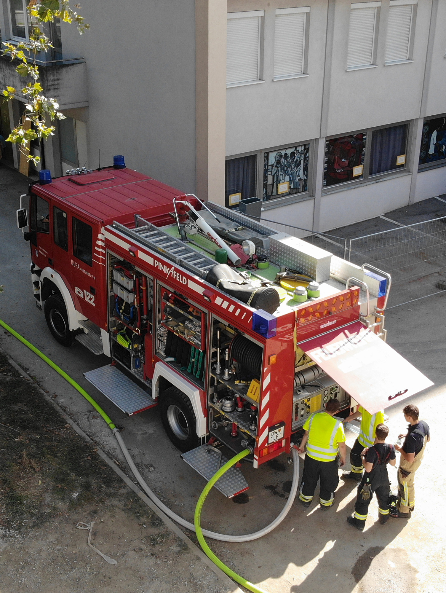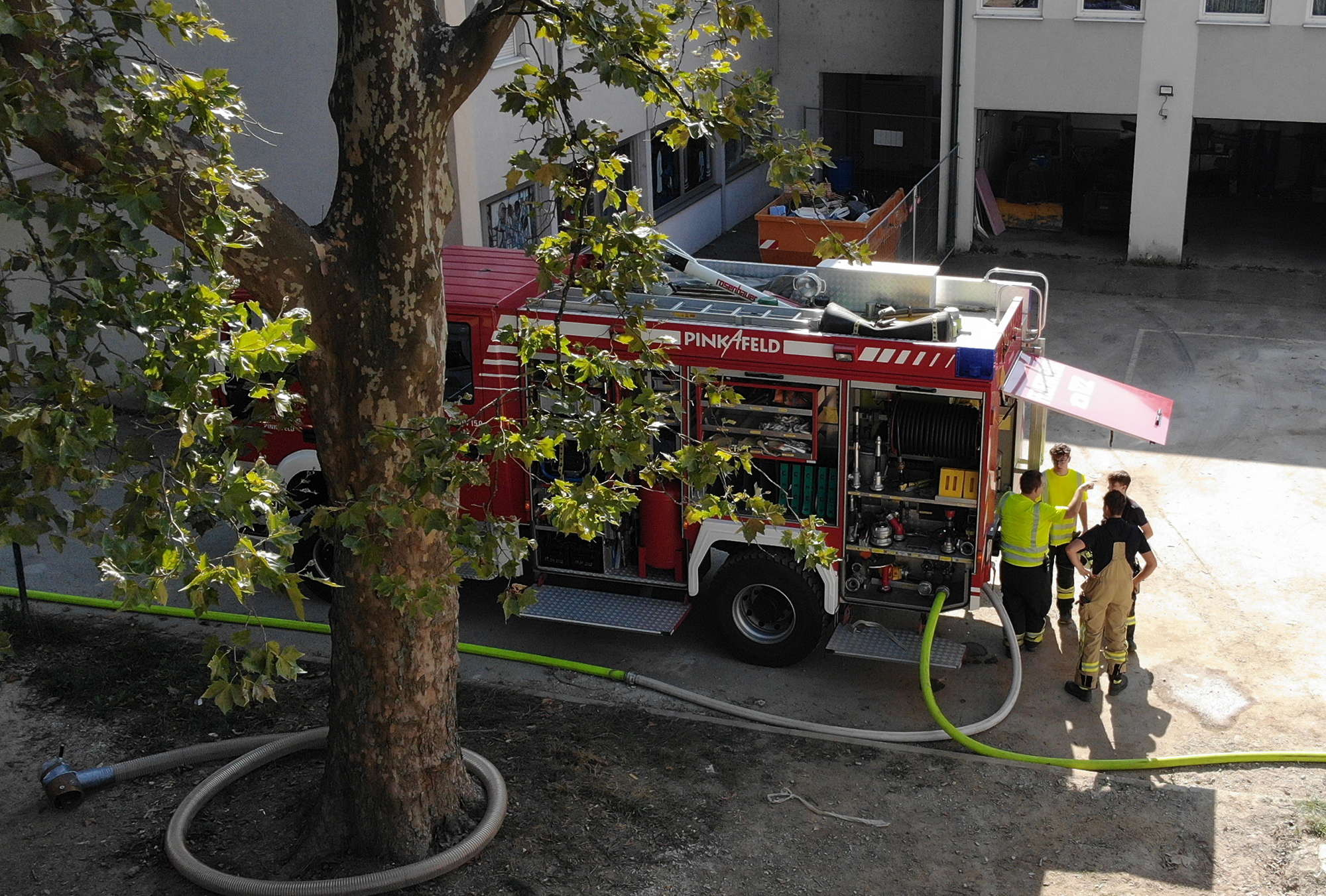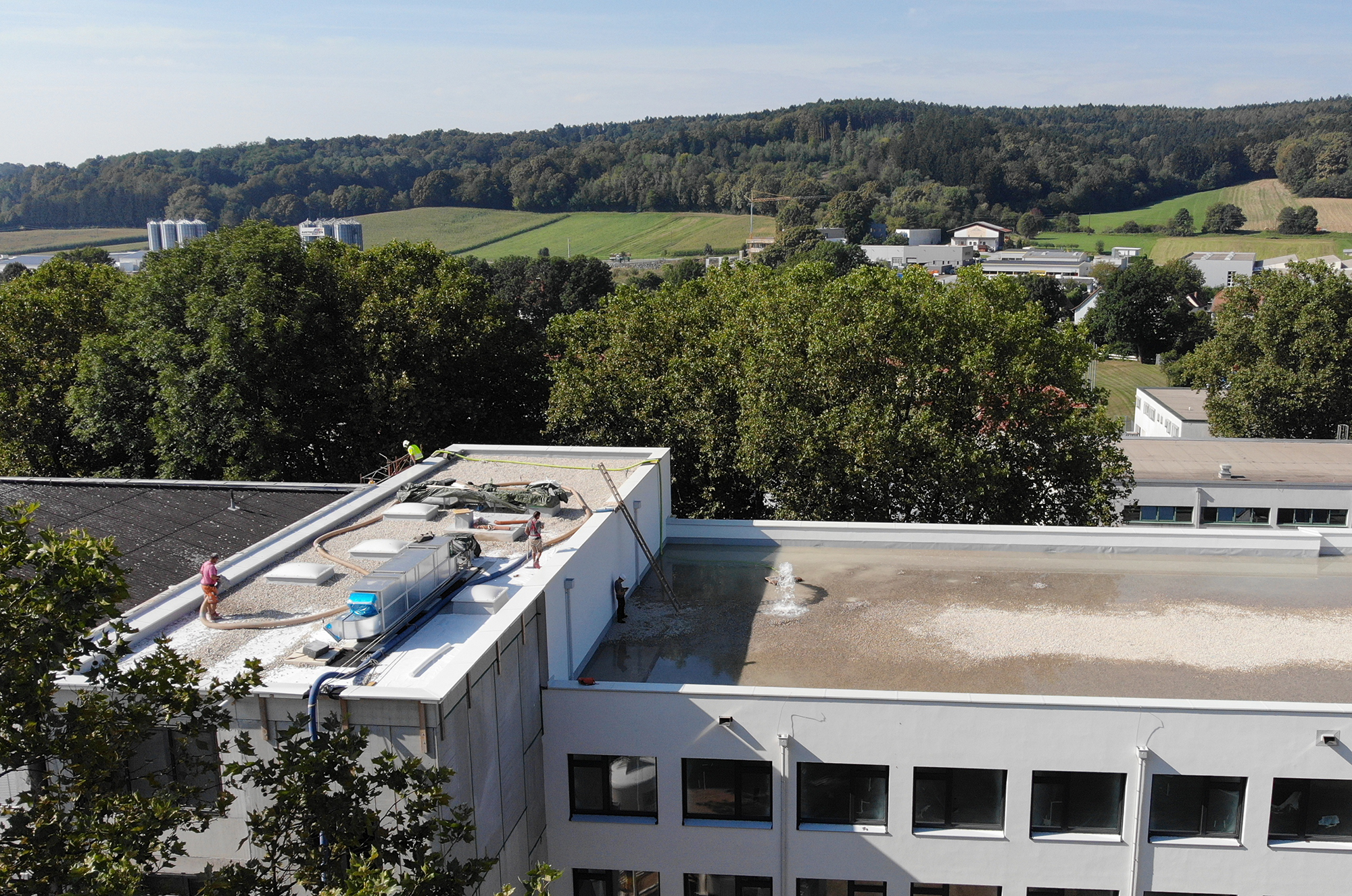 In Kooperation mit der Stadtfeuerwehr Pinkafeld wurde ein Wassertransport für eine Dichtheitsprobe des neuen Flachdachs durchgeführt. Nach einer umfangreichen Baustellenunterweisung durch den Polier wurde mit dem Aufbau einer Transportleitung begonnen. In einer Zeit von zwei Stunden wurde die stattliche Wassermenge von 90 m³ auf das Dach gefördert.
