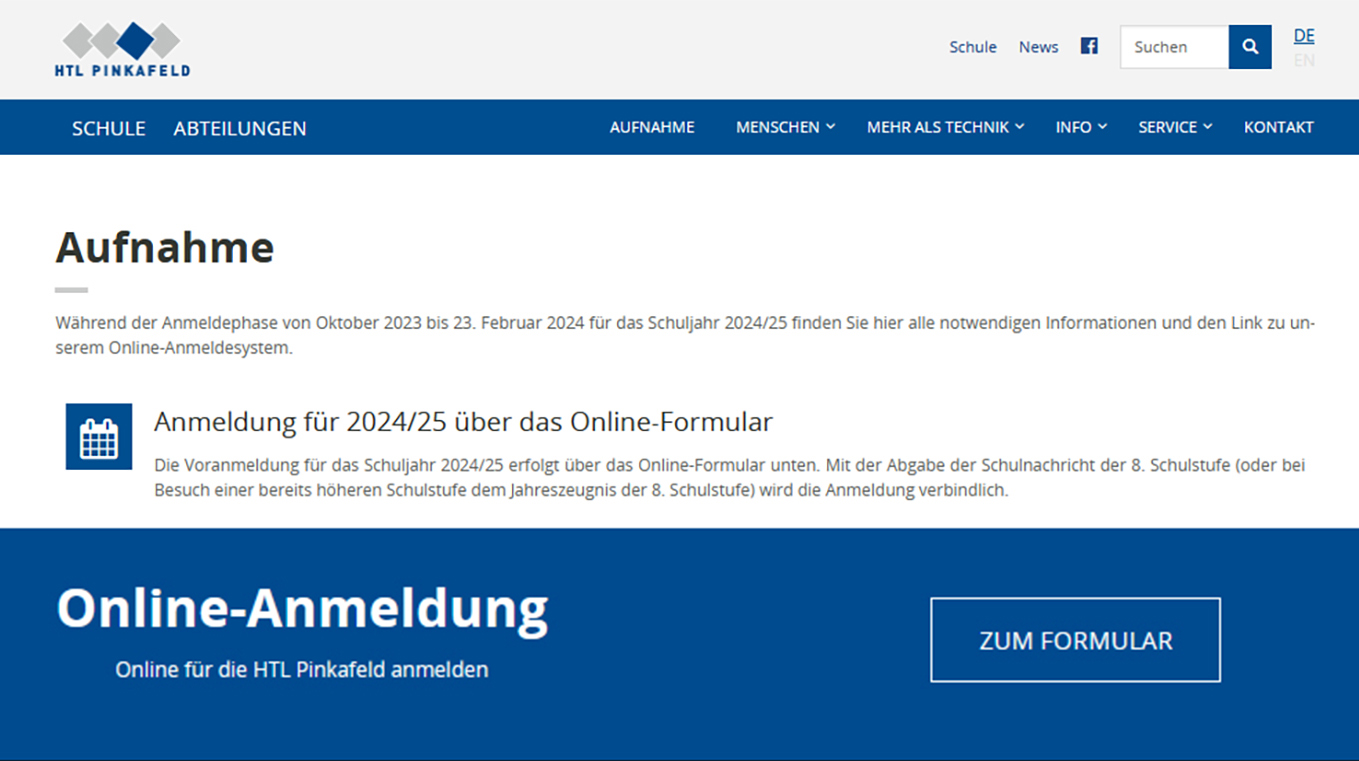 Ab sofort besteht die Möglichkeit, sich online für das nächste Schuljahr 2024/25 an der HTL Pinkafeld anzumelden.