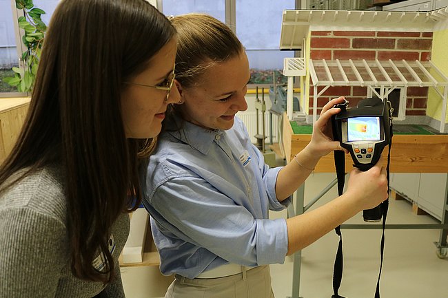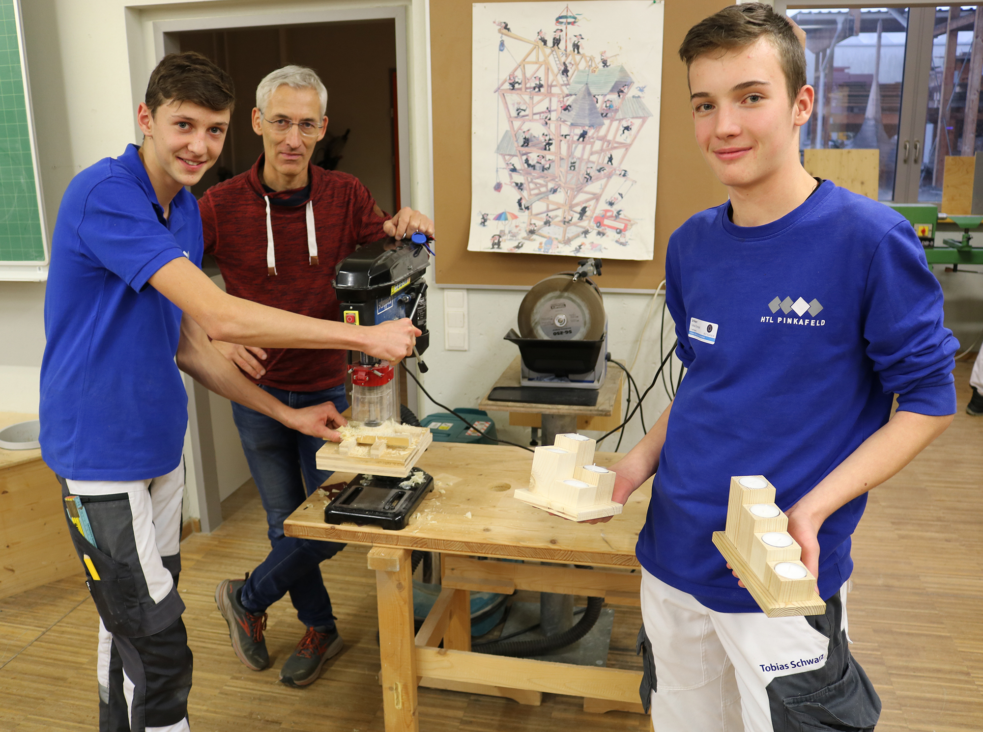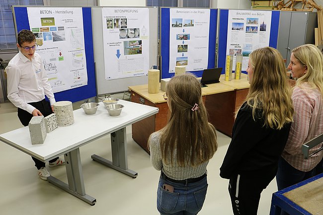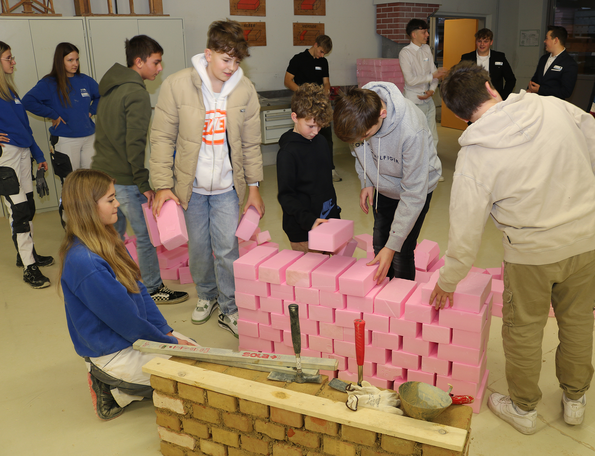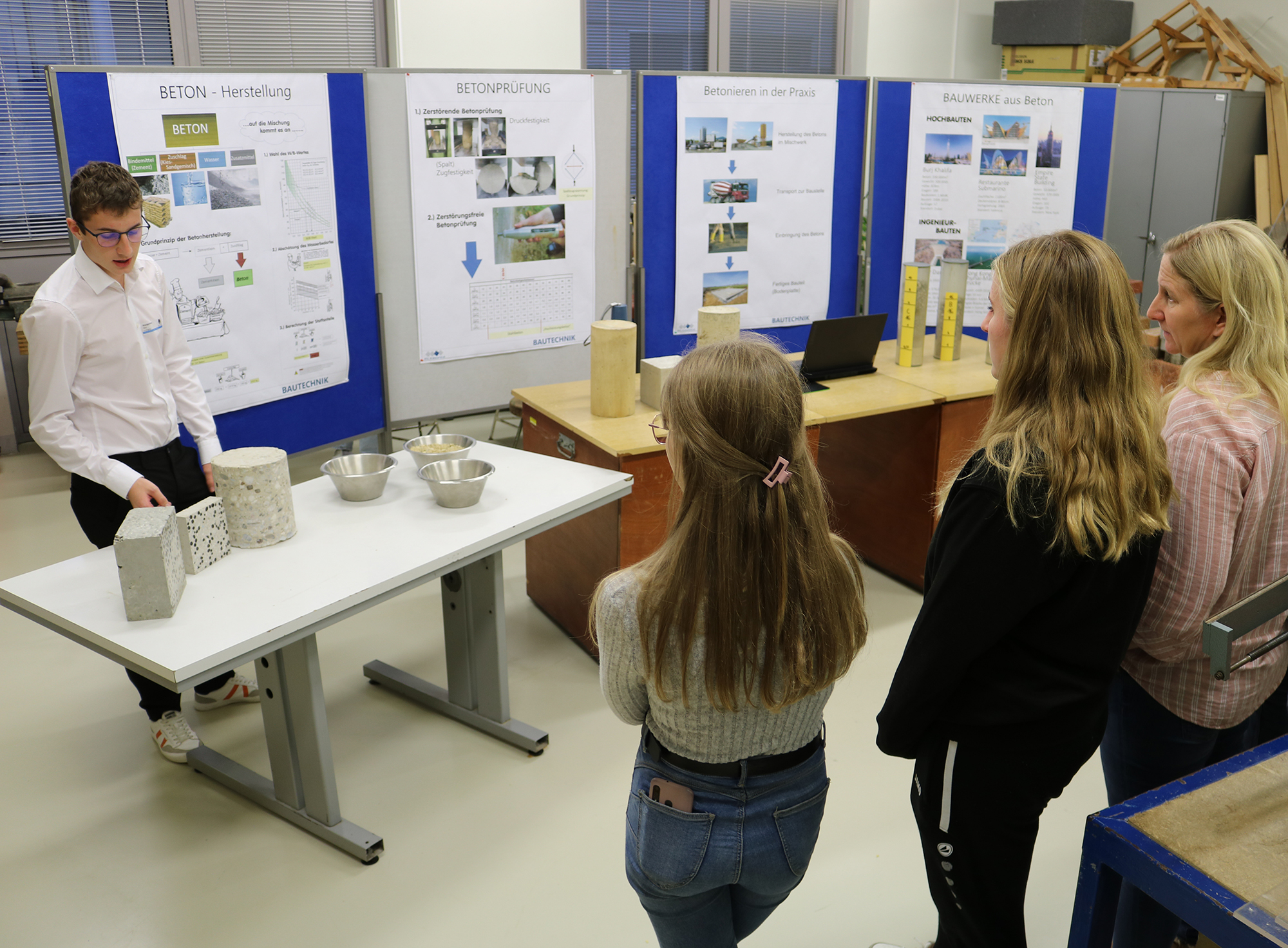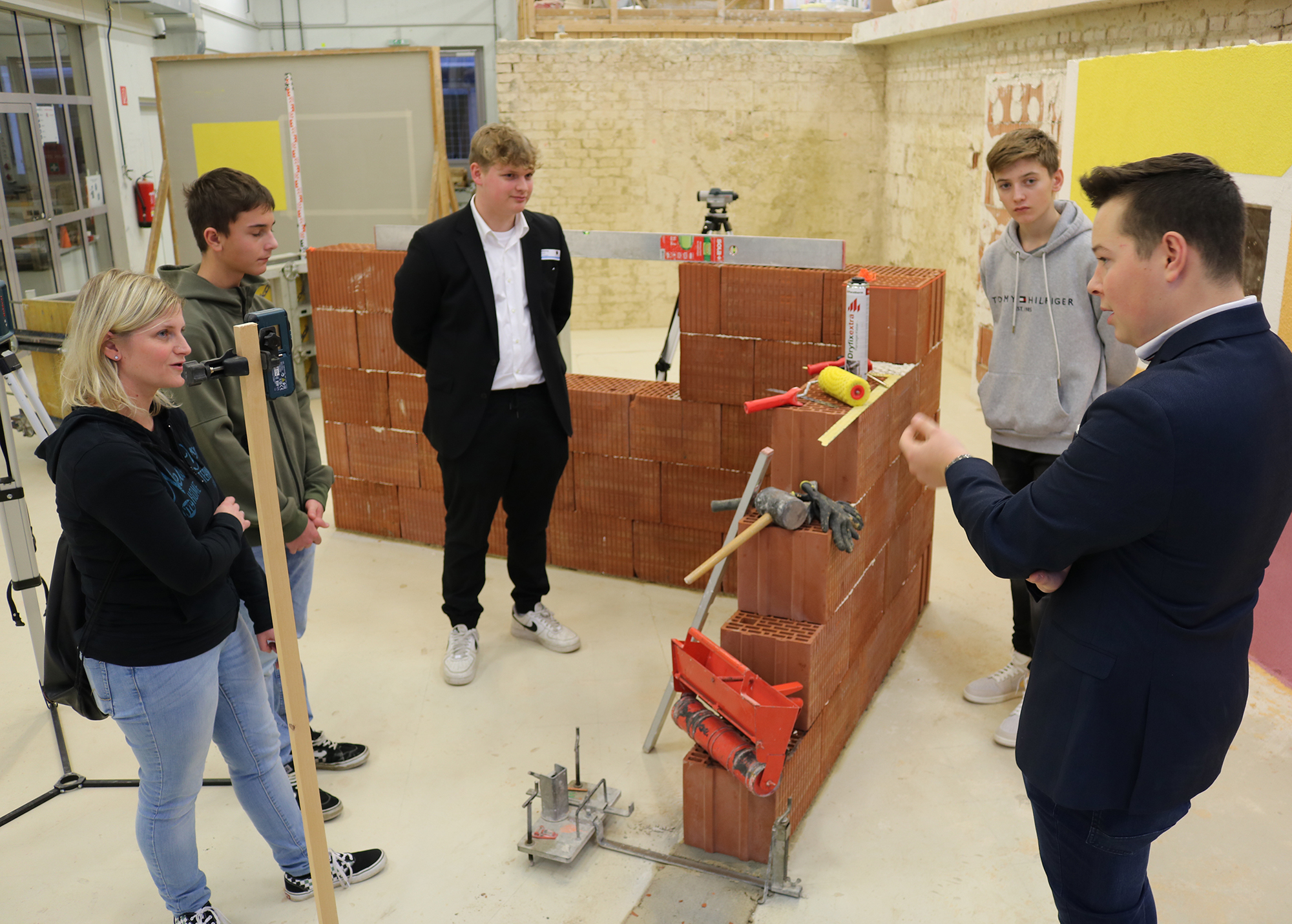 So wurden die verschiedenen Aspekte des Unterrichts anhand der Gegenstände und von Diplomarbeiten erläutert. Im Baulabor wurden Holz- und Betonversuche durchgeführt, die Zukunft des virtuellen Bauens wurde mittels VR-Brille sowie 3D-Scannen und -Drucken demonstriert. Die Wärmebildkamera zeigte am Modellhaus sehr anschaulich potentielle Schwachstellen. Wesentliche Teile des fachpraktischen Unterrichts in der Zimmerei und Maurerei konnten am Ende des Rundgangs selbst ausprobiert werden.