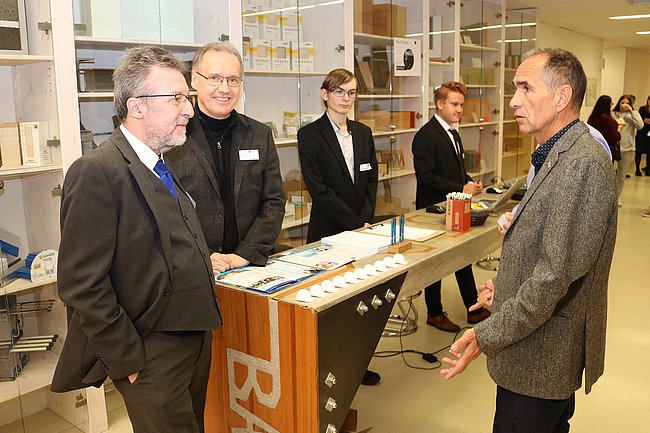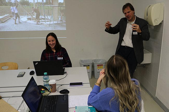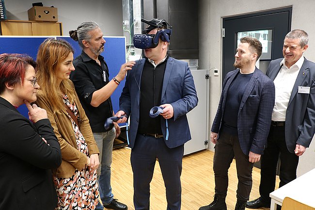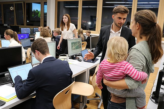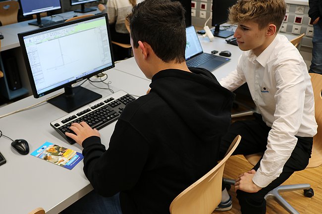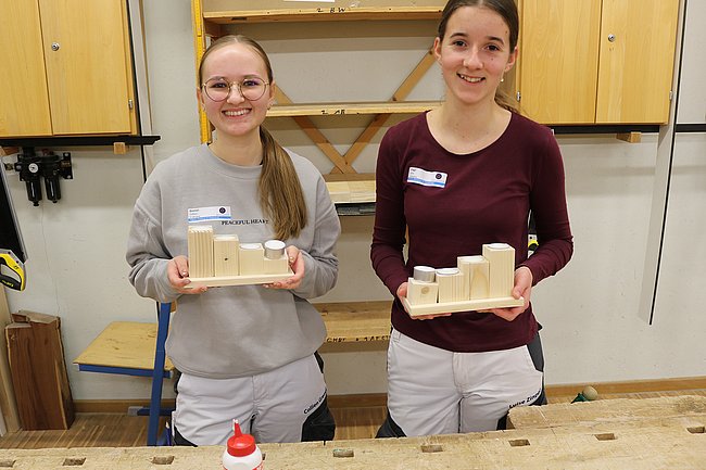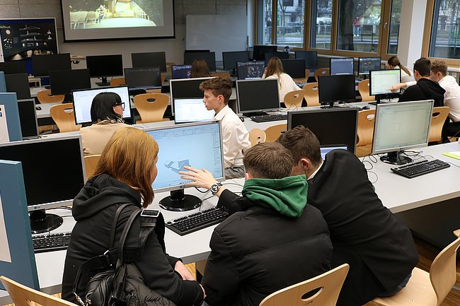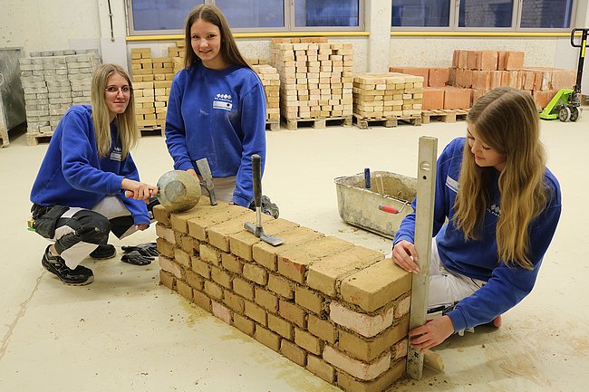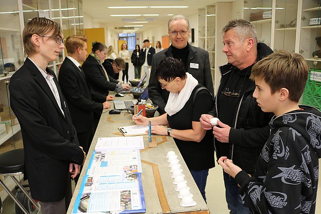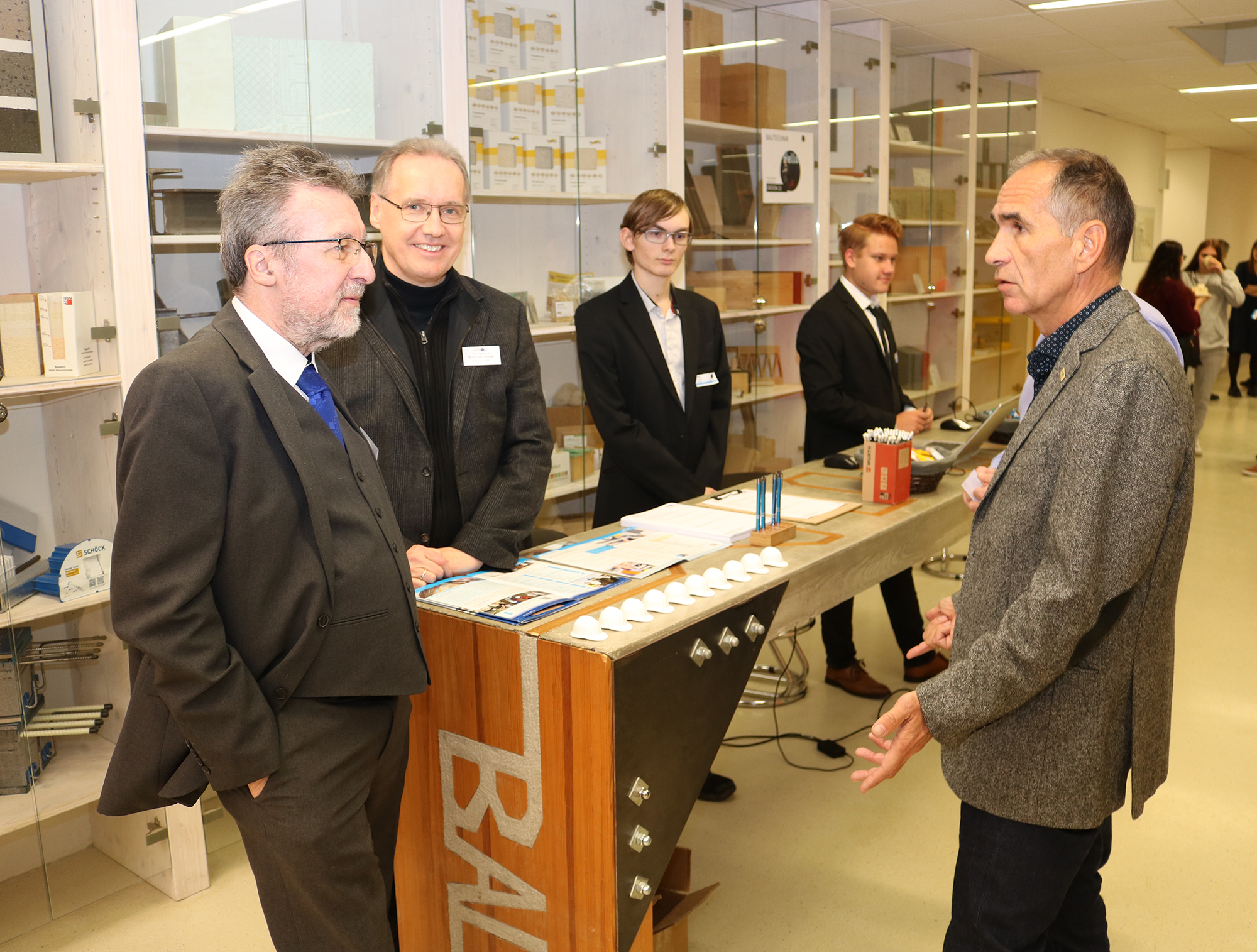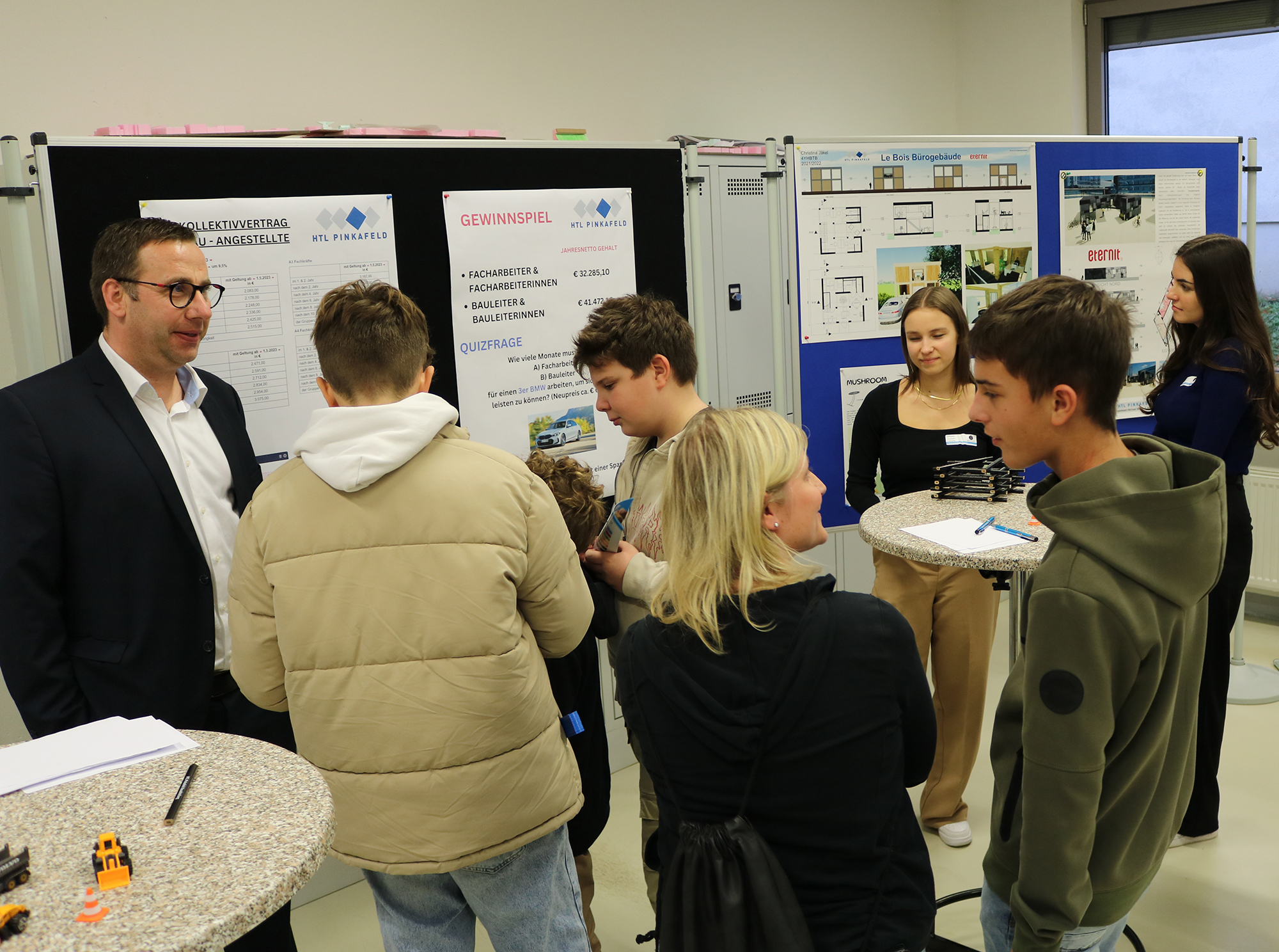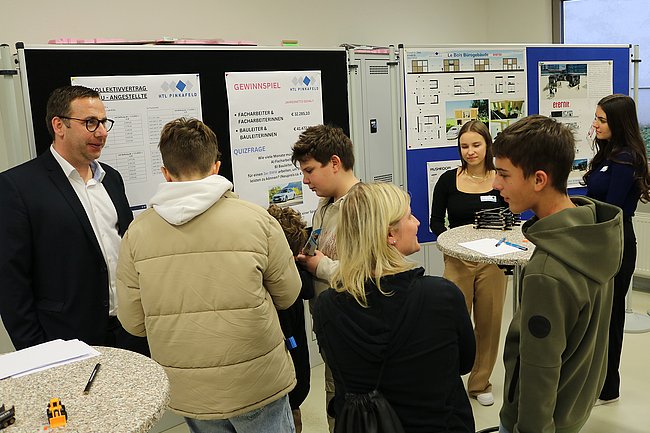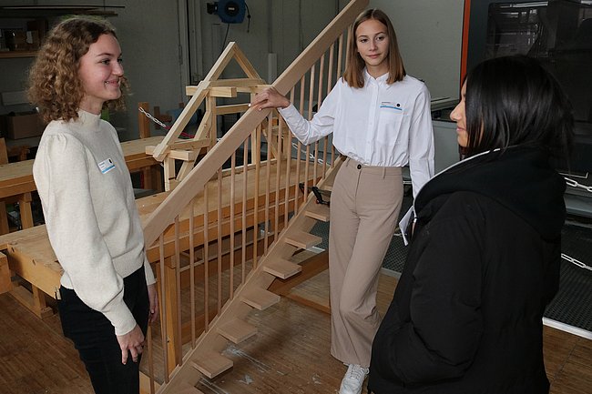 So wurden die verschiedenen Aspekte des Unterrichts anhand der Gegenstände und von Diplomarbeiten erläutert. Im Baulabor wurden Holz- und Betonversuche durchgeführt, die Zukunft des virtuellen Bauens wurde mittels VR-Brille sowie 3D-Scannen und -Drucken demonstriert. Die Wärmebildkamera zeigte am Modellhaus sehr anschaulich potentielle Schwachstellen. Wesentliche Teile des fachpraktischen Unterrichts in der Zimmerei und Maurerei konnten am Ende des Rundgangs selbst ausprobiert werden.