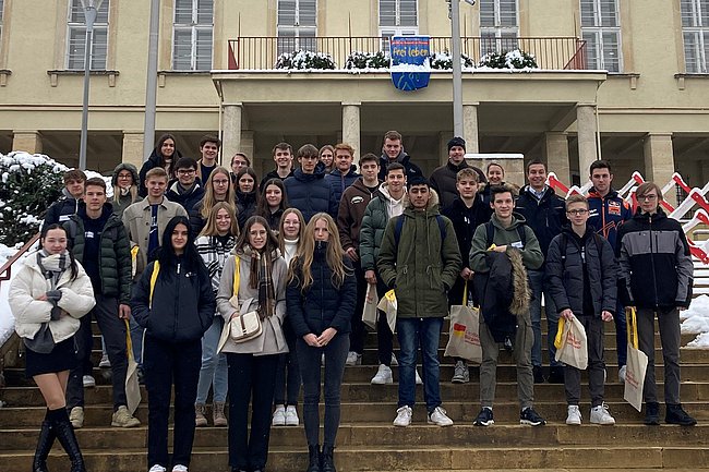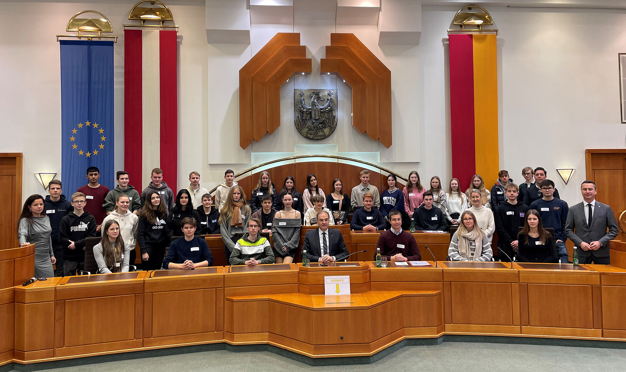 Anfang Dezember erlebten die Schülerinnen und Schüler der 4. Bautechnik-Klasse gemeinsam mit ihren Geschichteprofessoren Mark Wagner-Schleich und Sonja Szelinger den Burgenländischen Landtag hautnah.