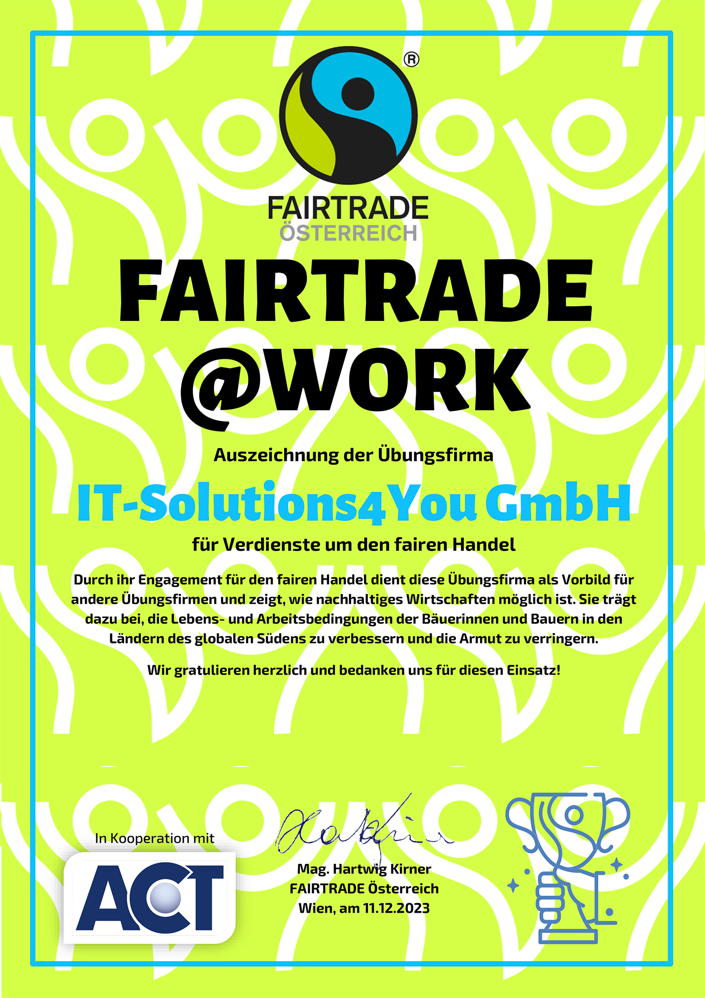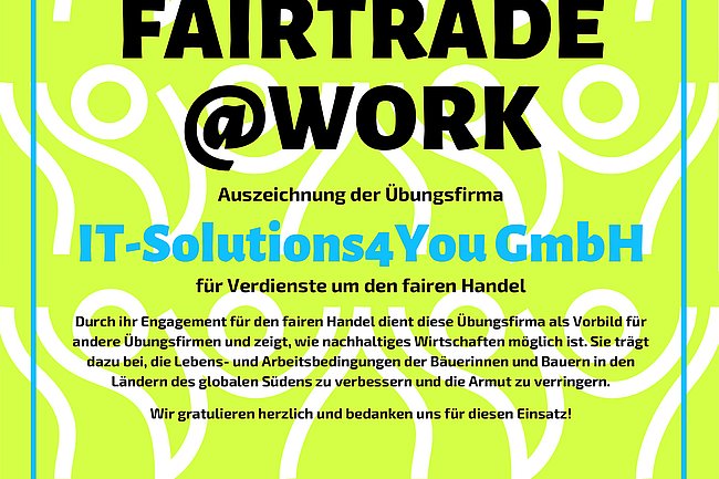 Ein weiteres Mal wurde die Übungsfirma „IT-Solutions4You GmbH“ der HTL Pinkafeld von Fairtrade Österreich mit der Auszeichnung „FAIRTRADE@WORK“ ausgezeichnet.
