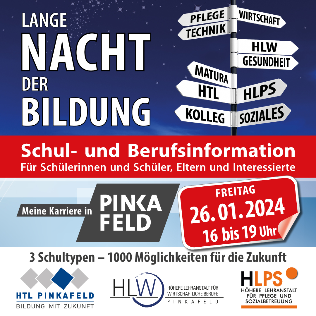 Die drei Pinkafelder Bildungseinrichtungen HLW, HLPS (am Standort HLW) und HTL laden gemeinsam mit Betrieben aus Wirtschaft und Industrie am Freitag, 26. Jänner 2024, von 16 bis 19 Uhr zur „Langen Nacht der Bildung“ ein. Bei dieser traditionellen Schul- und Berufsinformation für Schüler und Eltern erhalten alle Interessierten Auskunft und Einblick in die vielfältigen Ausbildungs-, Berufs- und Karrieremöglichkeiten in Pinkafeld.