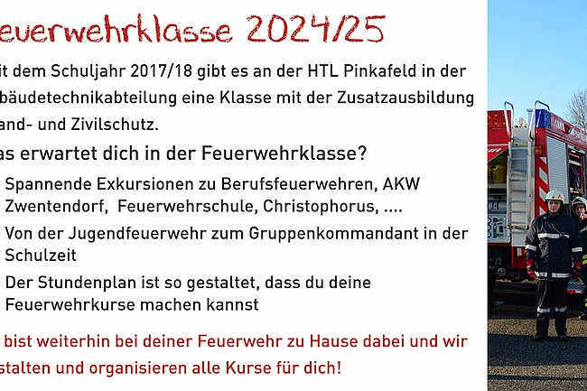 Auch im kommenden Schuljahr startet wieder eine Gebäudetechnik-Klasse mit der Zusatzausbildung „Brand- und Zivilschutz“. Dort ist der Stundenplan so gestaltet, dass neben der Absolvierung der HTL während der Schulzeit Feuerwehrkurse besucht werden können und eine Ausbildung von der Jugendfeuerwehr bis zum Gruppenkommandanten möglich ist.