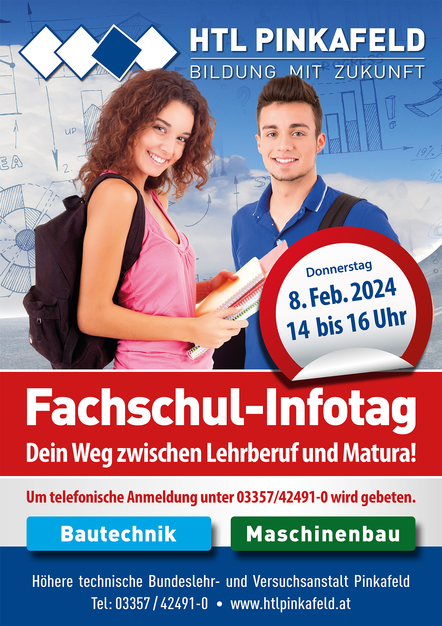 Am Donnerstag, 8. Februar 2024, findet von 14 bis 16 Uhr ein Info-Nachmittag für alle technisch Interessierten statt, die einen alternativen Ausbildungsweg zwischen Lehre und Matura anstreben. Dort wird die vierjährige Fachschule mit den Ausbildungsschwerpunkten „Bautechnik“ oder „Maschinenbau – Anlagentechnik“ der HTL Pinkafeld vorgestellt.