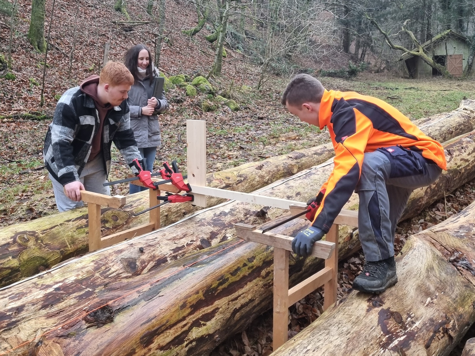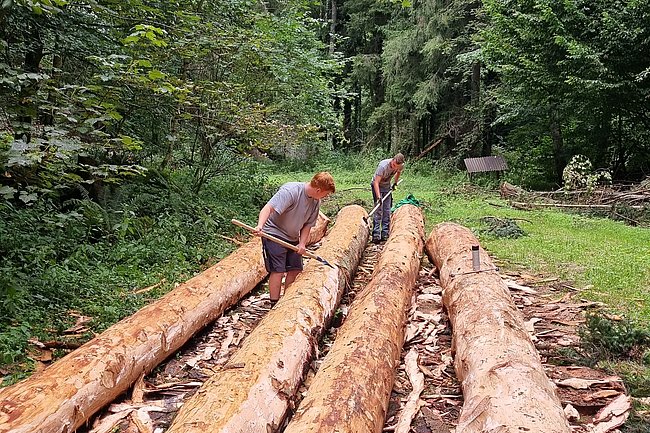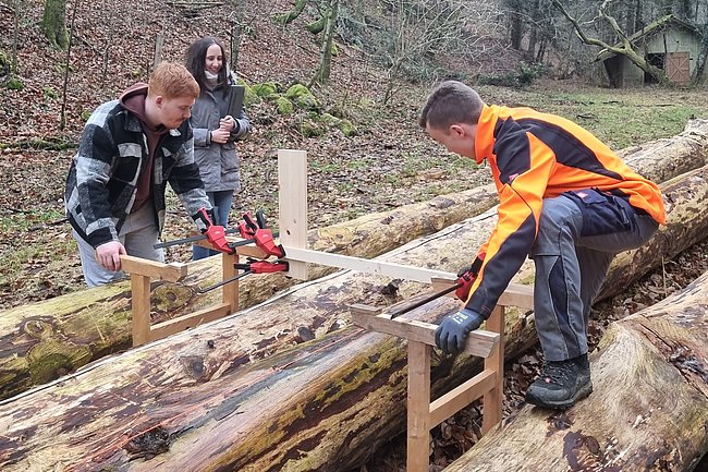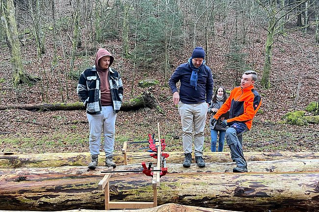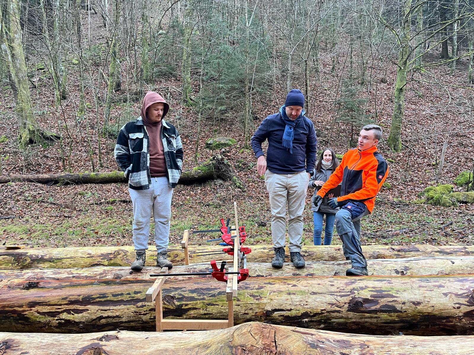 Danach begab man sich auf die Suche nach fünf geeigneten Bäumen, die schließlich gefällt, entrindet und vermessen wurden. Zur Feststellung des E-Moduls erfolgte ein Biegeversuch vor Ort. Parallel dazu arbeiten die Schüler*innen an der Einreichplanung bzw. Modellierung mit der Finite Elemente Methode.