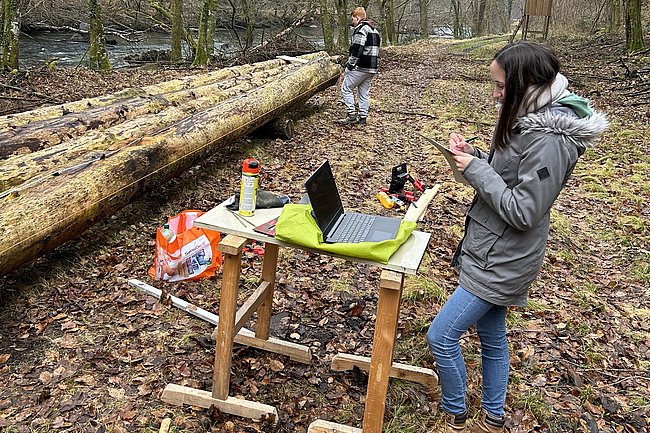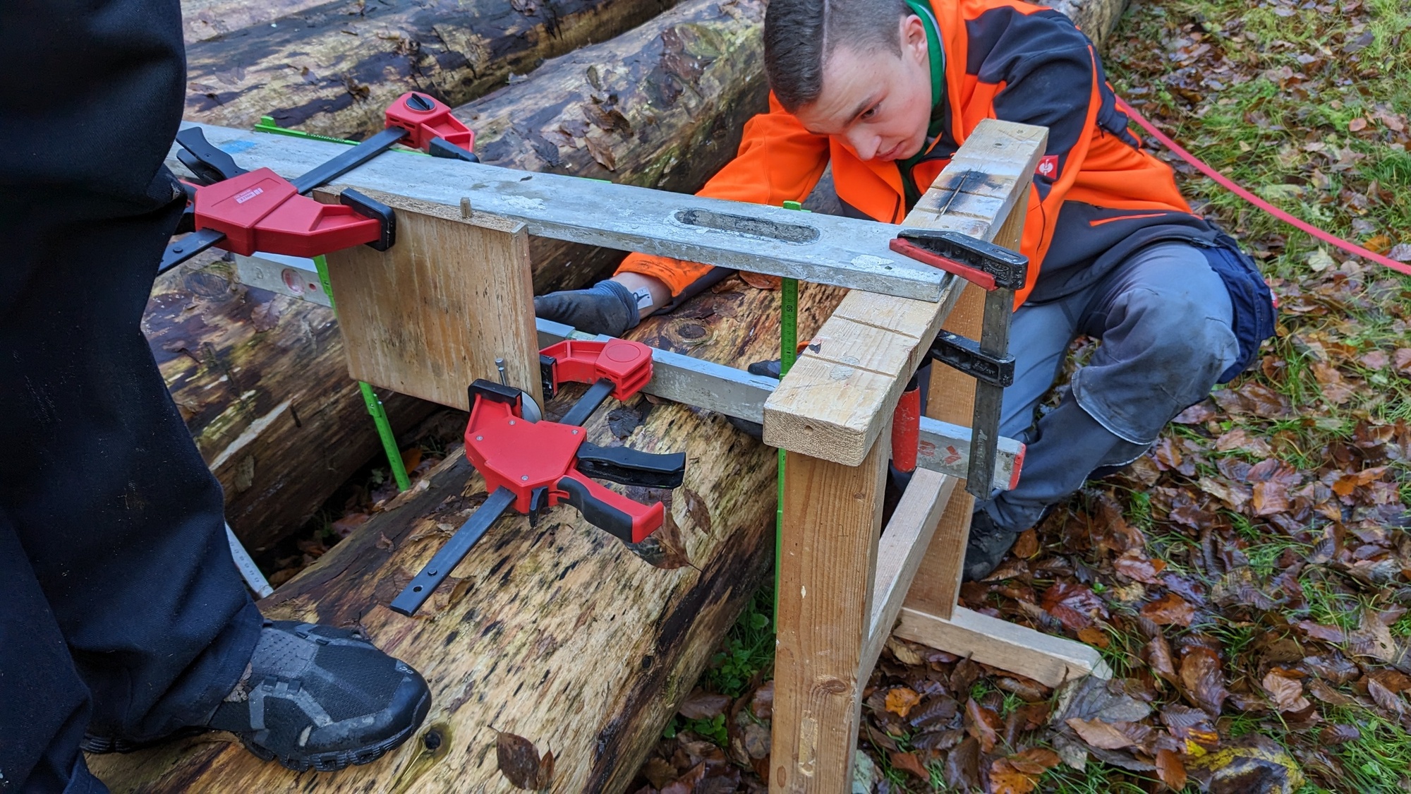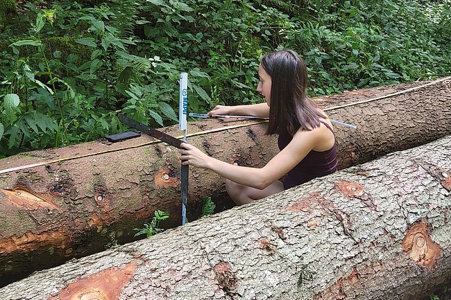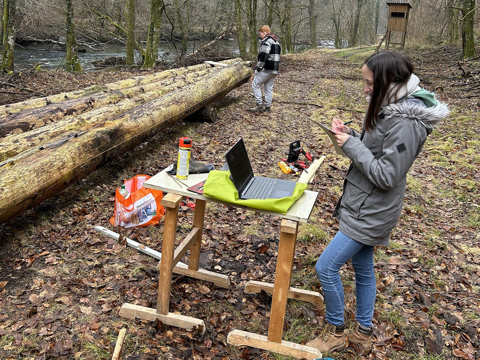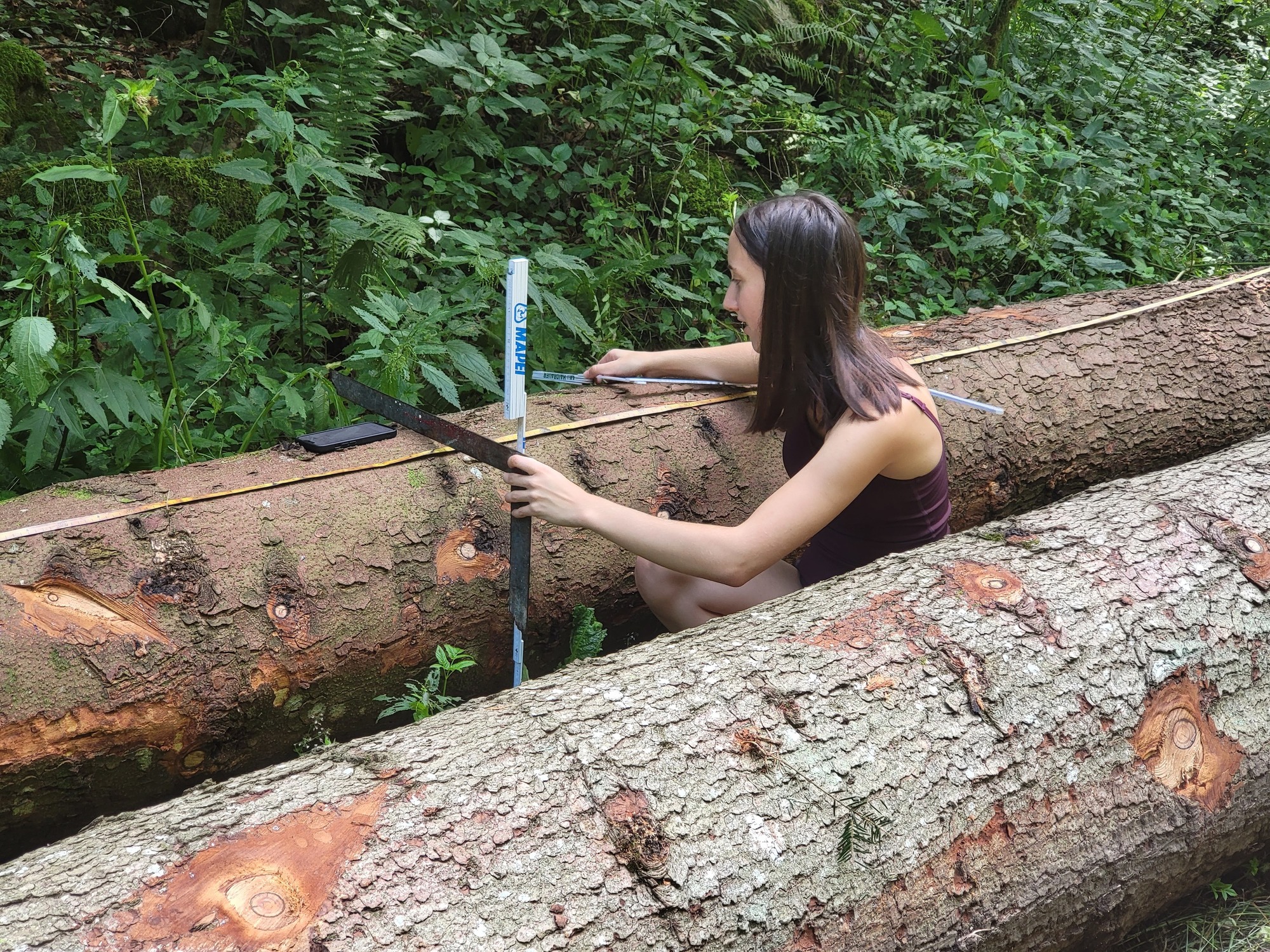 Danach begab man sich auf die Suche nach fünf geeigneten Bäumen, die schließlich gefällt, entrindet und vermessen wurden. Zur Feststellung des E-Moduls erfolgte ein Biegeversuch vor Ort. Parallel dazu arbeiten die Schüler*innen an der Einreichplanung bzw. Modellierung mit der Finite Elemente Methode.