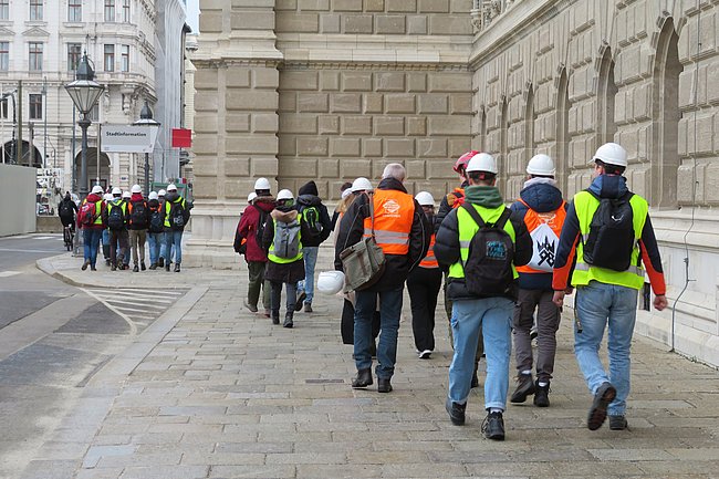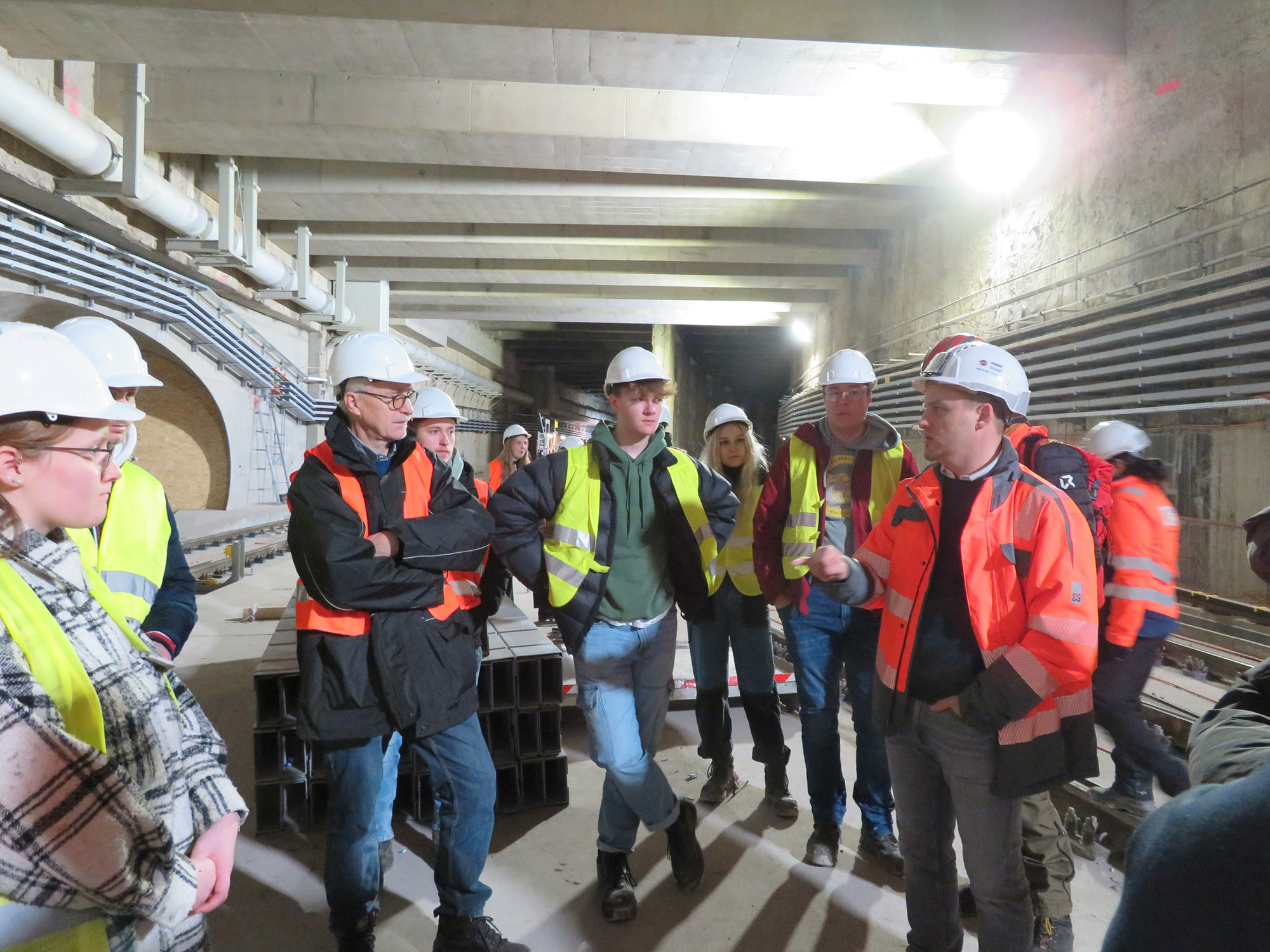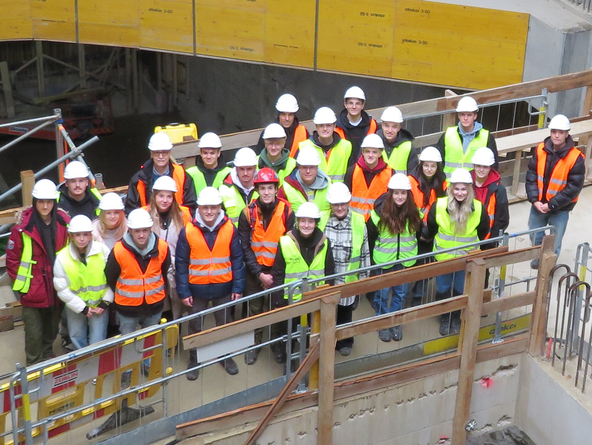 Mitte Februar hatten die Bautechnik-Schülerinnen und -Schüler der 5YHBTT/B die Möglichkeit, gemeinsam mit ihren Professoren Peter Derler und Hans Glatz die aktuelle U-Bahn-Baustelle Linienkreuz U5xU2 in Wien zu besichtigen. Ausgehend vom Schacht am Friedrich-Schmidt-Platz beim Wiener Rathaus, welcher später als U-Bahn-Station verwendet wird, wurden verschiedene Tunnelröhrenabschnitte begangen. Dabei konnten die im Unterricht erlernten Themen wie beispielsweise Tunnelvortrieb in NÖT-Bauweise, Voraussicherungsmaßnahmen mittels Spieße oder DSV-Schirm sowie auch die Herstellung der Tunnelinnenschale mittels Schalwagen hautnah erlebt werden. Besonders interessant war auch der Übergang zur Bestandsstrecke der Linie U2, wo die längsten Großbohrpfähle Wiens – mit einer Länge von über 60 Meter – direkt neben der Universität Wien abgeteuft wurden.