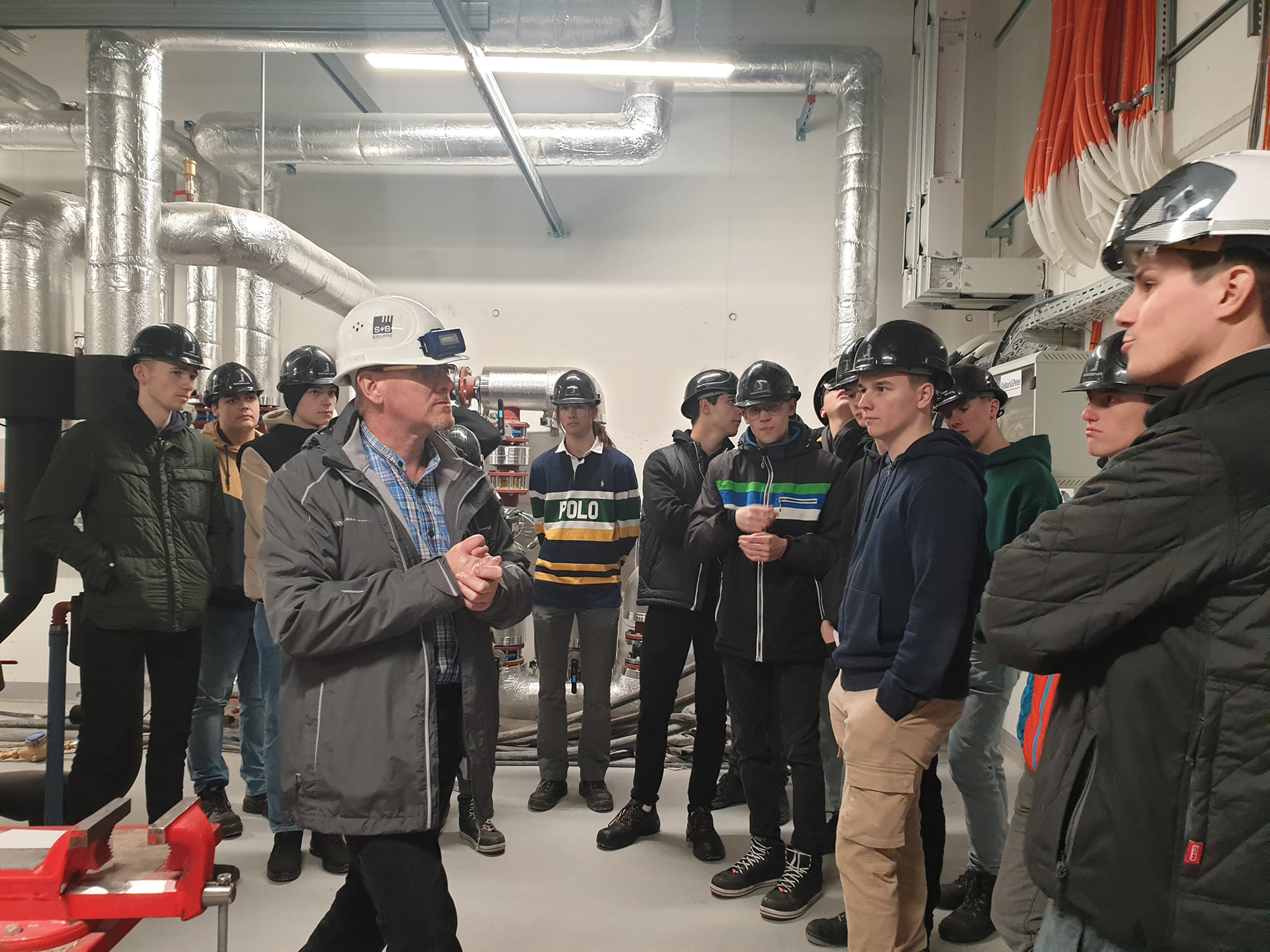 Herr Keck, ein Experte auf dem Gebiet der Technischen Gebäudeausrüstung (TGA), stellte der Schülergruppe das Konzept des Wohnhauses vor. So wird die Wohnanlage über Fernwärme beheizt, eine kontrollierte Wohnraumlüftung sorgt für angenehme Luft.