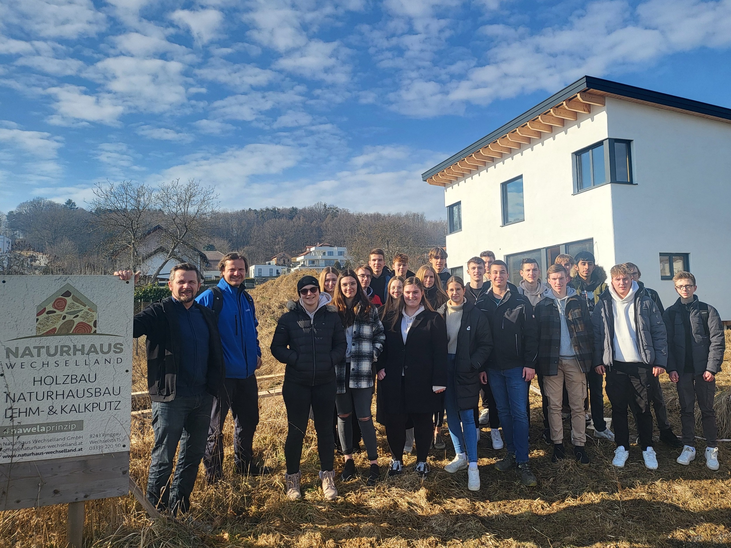 Kürzlich besichtigten die Bautechnik-Klassen 4YHBTB und 4YHBTT der HTL Pinkafeld im Rahmen des Erasmus Plus Projekts „Green Building“ ein Öko-Haus der „Naturhaus Wechselland GmbH“ in Pinkafeld. Begleitet wurden die Schülerinnen und Schüler von Prof. Wolfgang Leeb und Klassenvorstand Prof. Christoph Schermann.