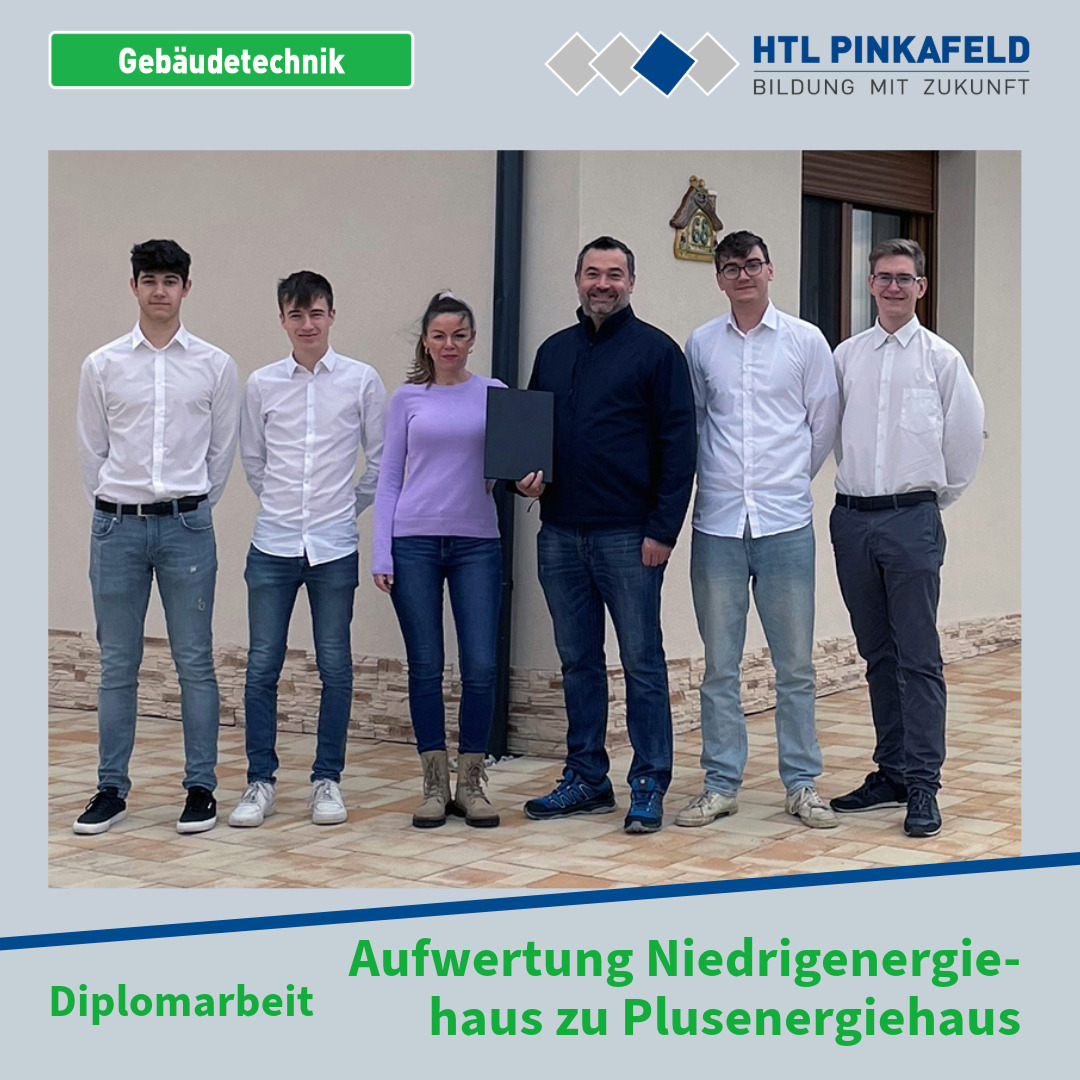 Ende März wurde die Diplomarbeit „Gebäudetechnische Aufwertung eines Niedrigenergiehauses zu einem Plusenergiehaus“ von den Gebäudetechnik-Maturanten Tobias Jandrisevits, Vincent Jost, Lorenz Laky und Justin Trinkl an den Betreuer Prof. Christoph Ebner übergeben.