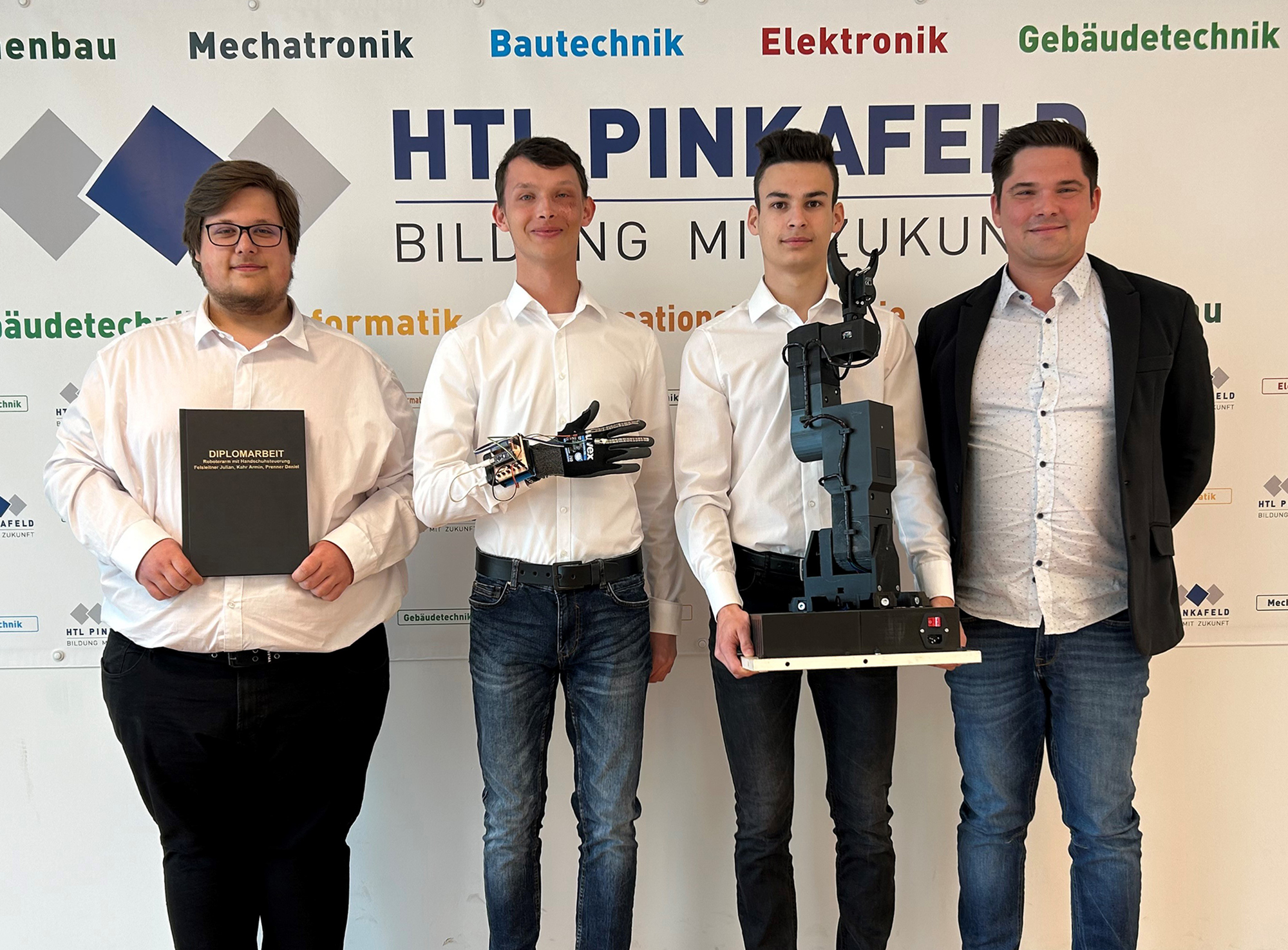 Anfang April wurde die Elektronik-Diplomarbeit „Greifarmroboter mit Handschuhsteuerung“ von den Maturanten Armin Kahr, Daniel Prenner und Julian Felsleitner an den Auftraggeber HTL Pinkafeld übergeben. Betreut wurde diese Diplomarbeit von Prof. Christian Josef Paar.