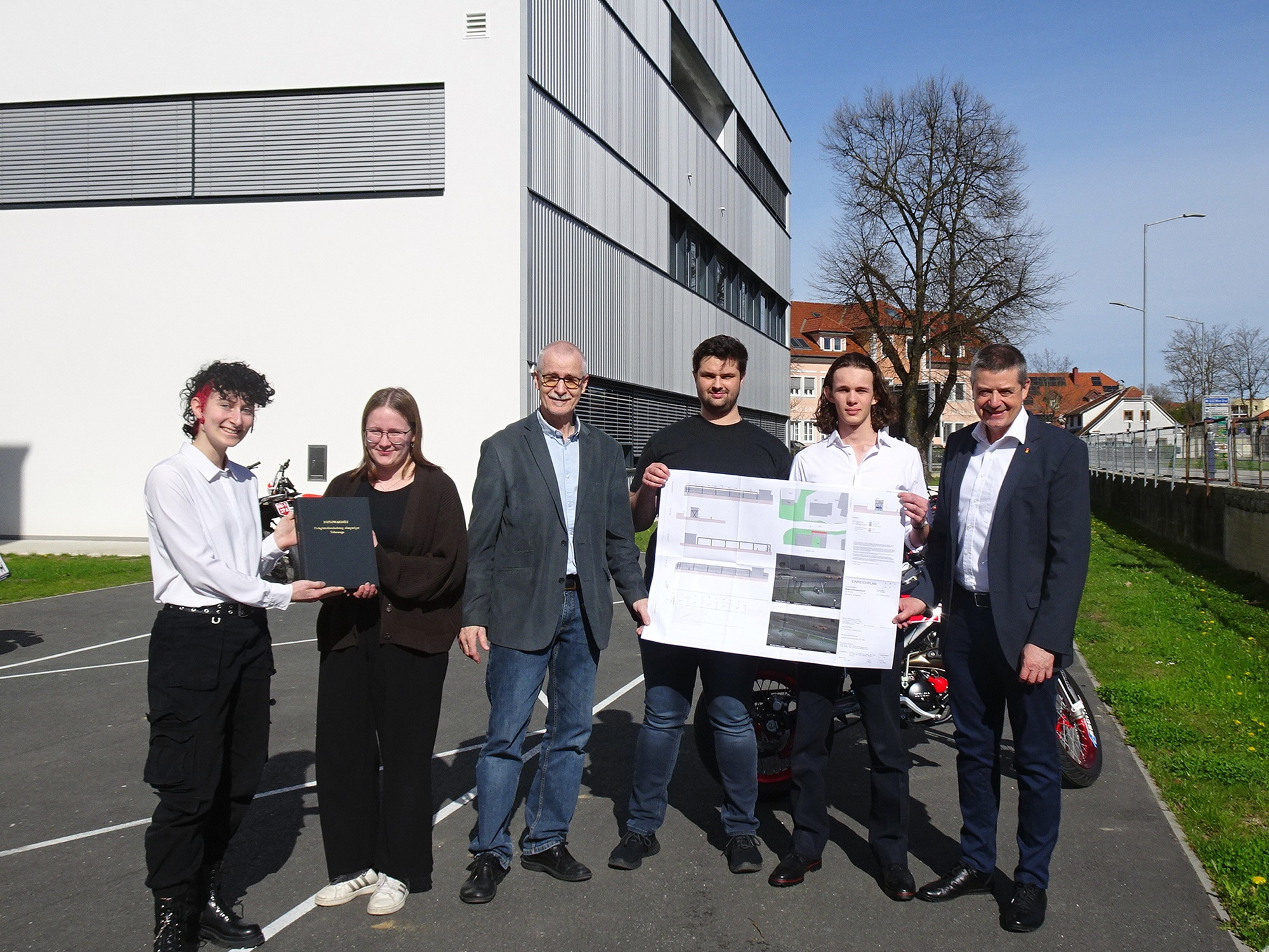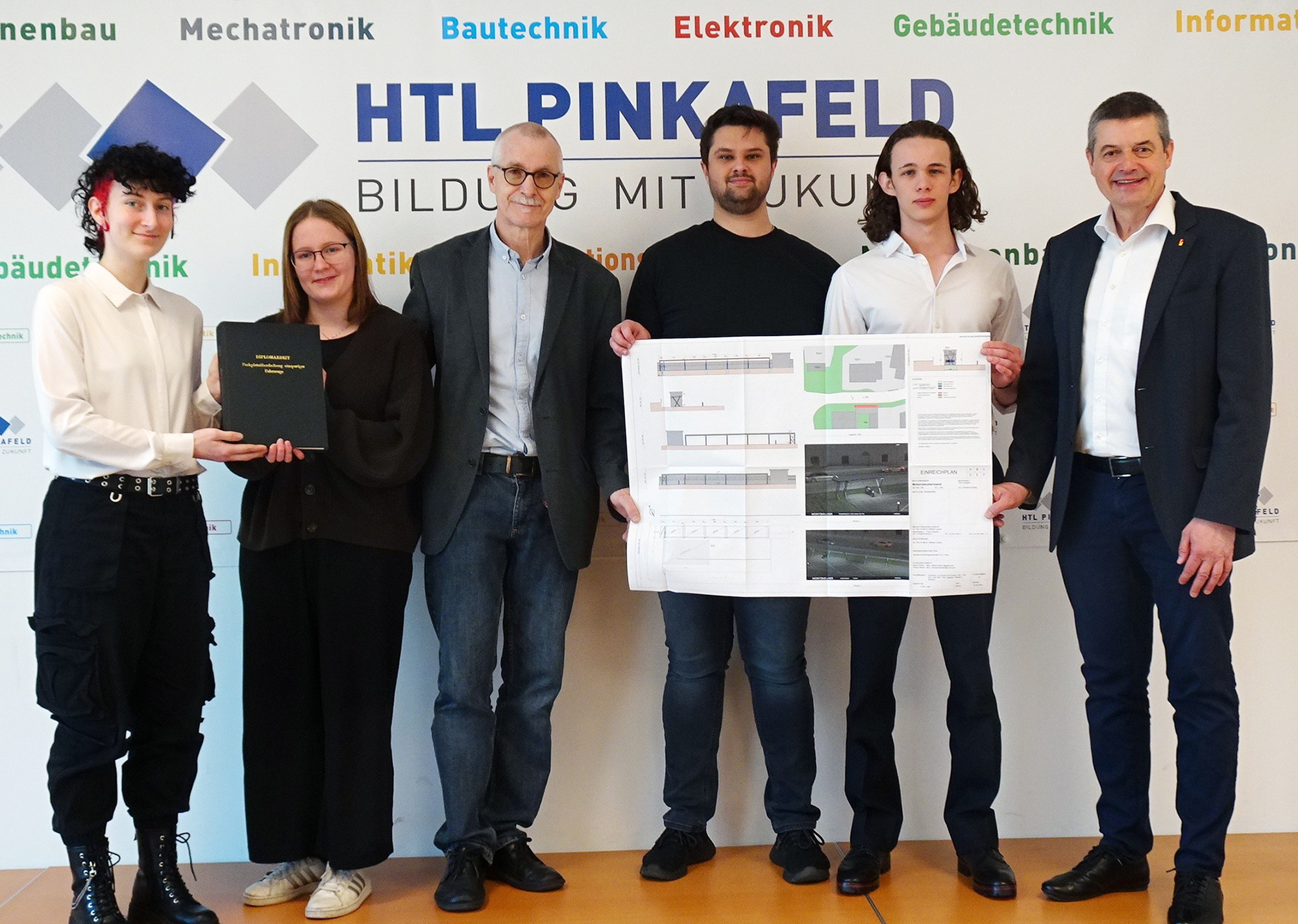 Die Bautechnik-Diplomarbeit zur Errichtung eines Zweiradabstellplatzes für die HTL Pinkafeld wurde kürzlich abgeschlossen und dem Auftraggeber Direktor Wilfried Lercher sowie dem Diplomarbeitsbetreuer OStR Peter Derler übergeben.