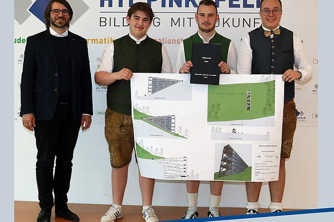 Nach intensiven Wochen der Projektbearbeitung wurde Mitte April die Diplomarbeit „Mikado“ von den Bautechnik-Maturanten Christoph Höfler, Joachim Halper und Andre Feldhofer, Ausbildungsschwerpunkt Holzbau, an ihren Betreuungslehre Prof. Christoph Schermann übergeben.